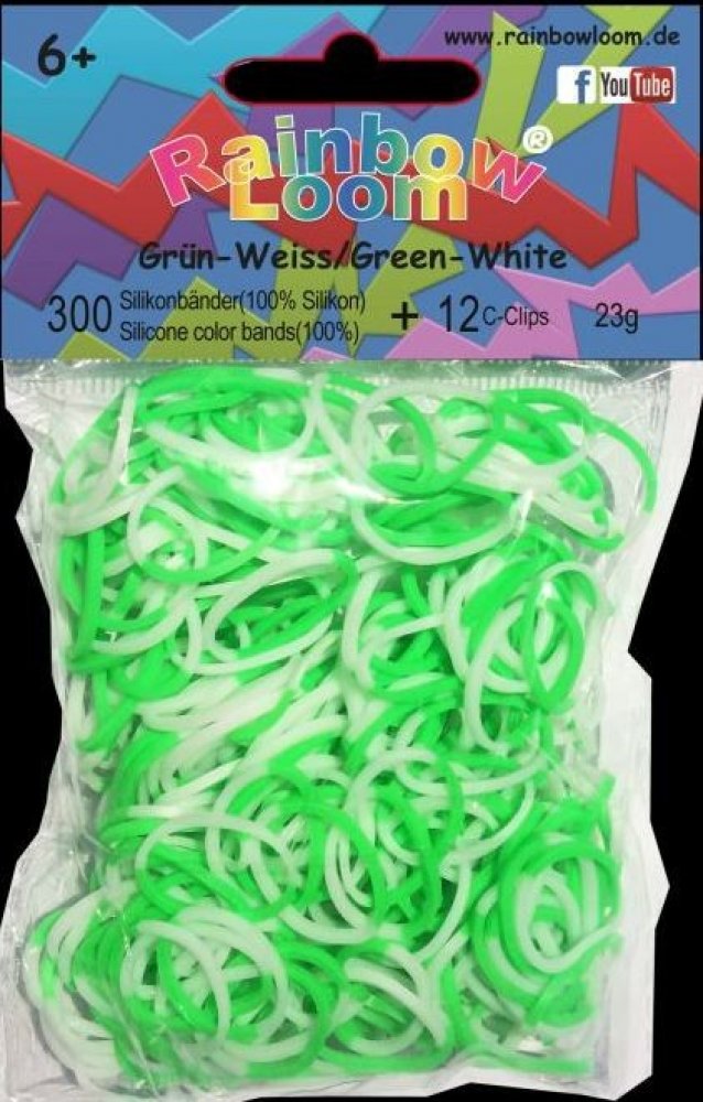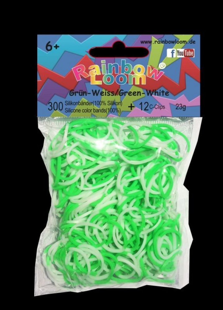 RAINBOW LOOM náhradní gumičky dvoubarevné jsou 100% silikonové, bezlatexové a jsou vysoce odolné. Balíček obsahuje 300 kusů gumiček zeleno-bílé a 12 kusů "C" svorek. Pro děti od 6 let, umí s nimi pracovat i 5 leté děti.
