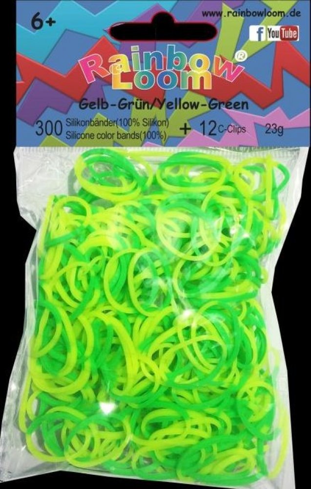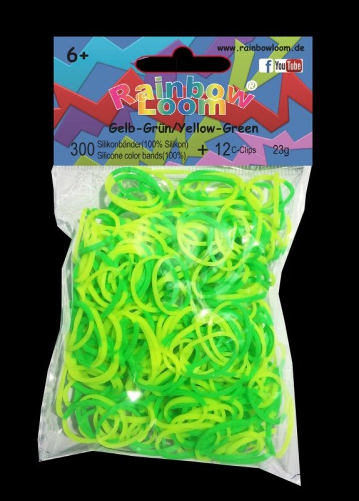 RAINBOW LOOM náhradní gumičky dvoubarevné jsou 100% silikonové, bezlatexové a jsou vysoce odolné. Balíček obsahuje 300 kusů gumiček žluto-zelené a 12 kusů "C" svorek. Pro děti od 6 let, umí s nimi pracovat i 5 leté děti.