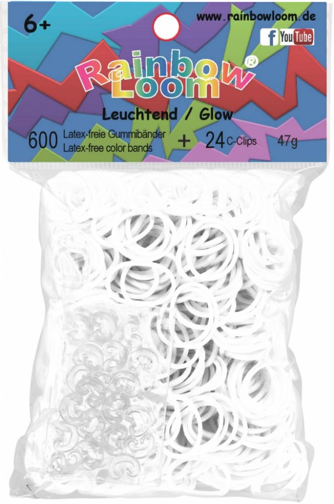 RAINBOW LOOM náhradní gumičky plné neprůsvitné jsou bezolovnaté, bez ftalátů a BPA. Balíček obsahuje 600 kusů fosforeskujících gumiček a 24 kusů "C" svorek. Pro děti od 6 let, umí s nimi pracovat i 5 leté děti.