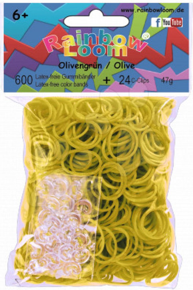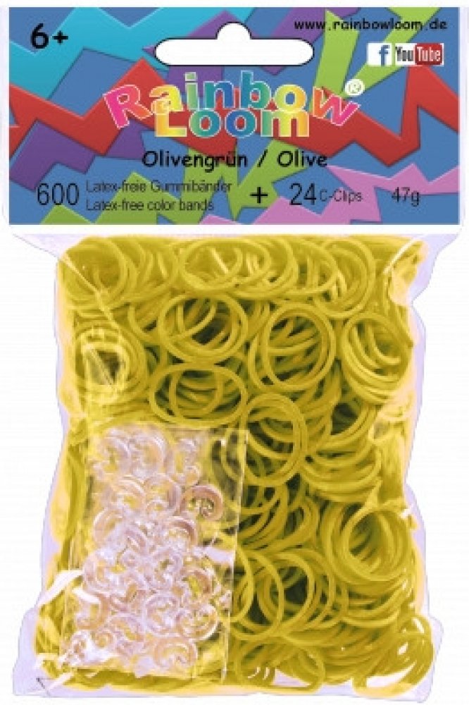 RAINBOW LOOM náhradní gumičky plné neprůsvitné jsou bezolovnaté, bez ftalátů a BPA. Balíček obsahuje 600 kusů olivově zelených gumiček a 24 kusů "C" svorek na uzavření náramků. Pro děti od 6 let, umí s nimi pracovat i 5 leté děti.