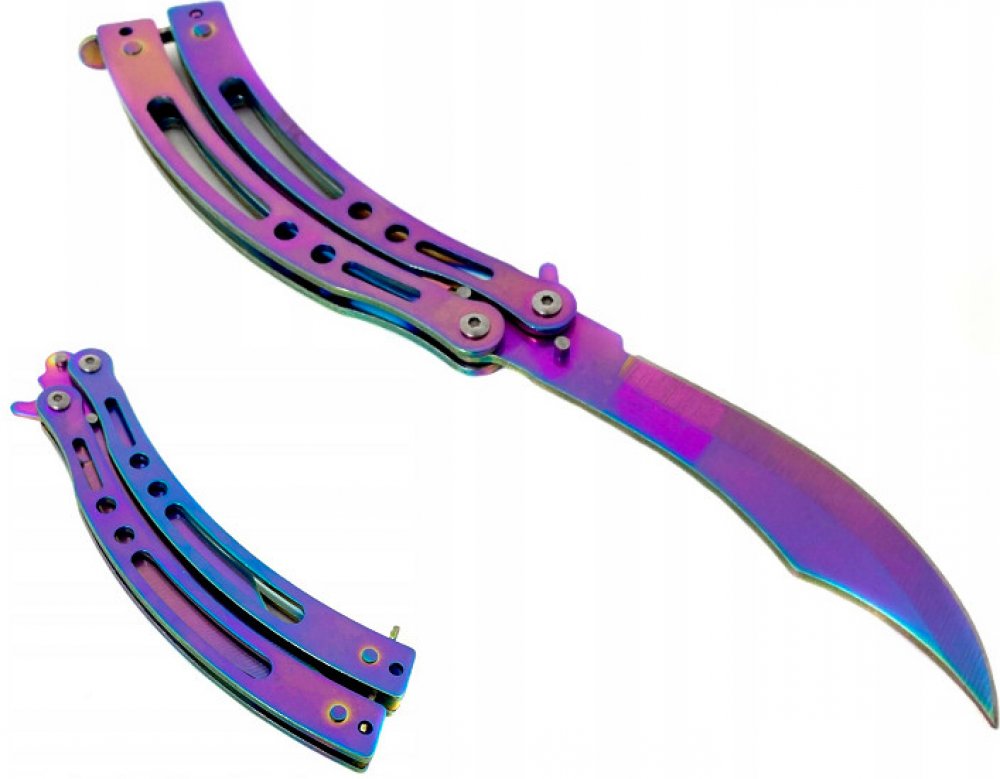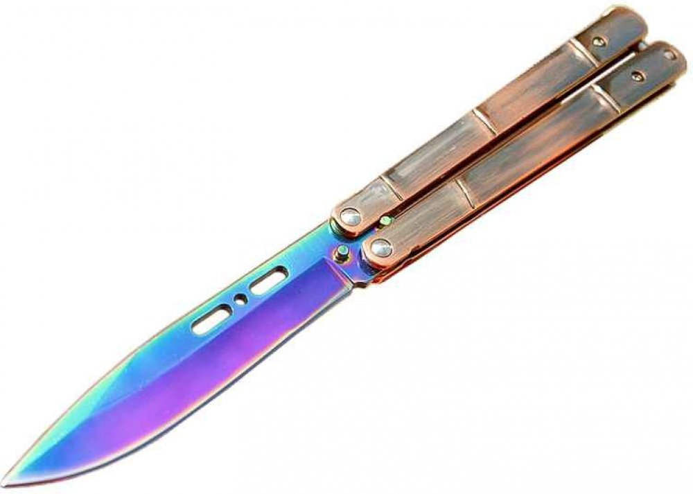 • celokovový nůž s čepelí v duhových barvách• zavírá se a otevírá překlopením obou částí rukojeti• na konci rukojeti je pojistka - západka pro zajištění nože ať už v zavřené nebo otevřené poloze• dodáván v nylonovém pouzdře, které lze připevnit na opasek• oblíbený bojový nůž hlavně u mladší generace