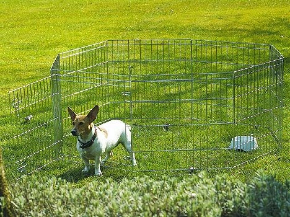 Prostor mezi dráty ohrádky je 2,8 cm. Ohrádka je vhodná pro dospělé psy i štěňata.