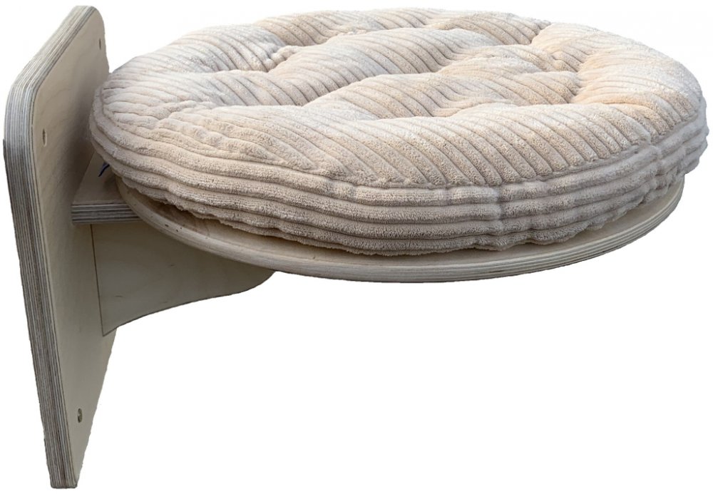 Dřevěná kulatá police pro kočky. Na zeď je připevněna pomocí držáku na zeď. Police je přizpůsobena k pevnému zavěšení na zeď.