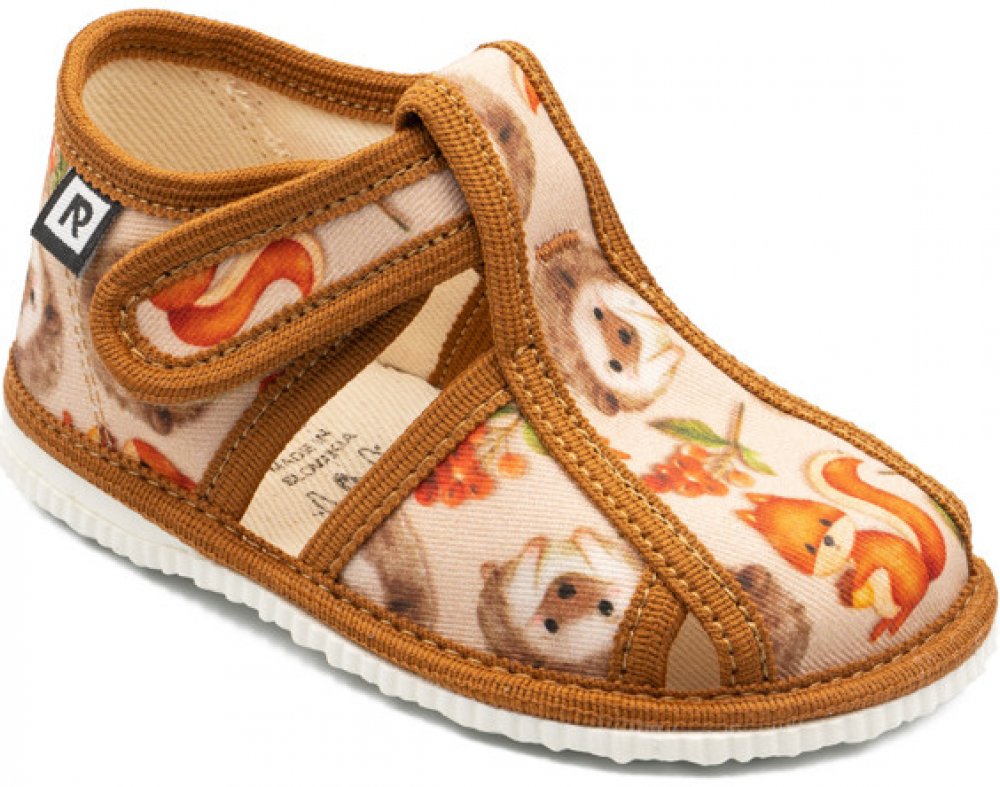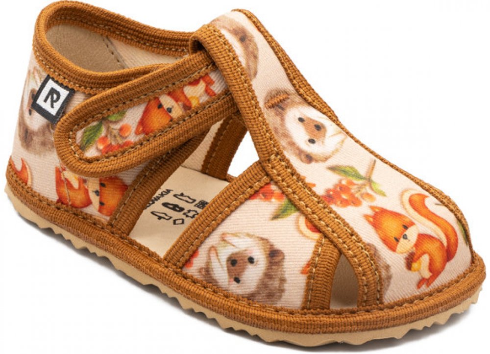 Dětská domácí obuv ze 100% bavlny a přírodní podšívkové kůže s prvky tzv. barefoot obuvi - výrazně flexibilní stélkou a podešví s nulovým dropem (rozdíl mezi výškou paty a špice oproti podložce je nula). Tento typ obuvi je vhodný do interiéru, ideální pro měkké resp. 3D povrchy, např. koberec, hrací podložky apod., krátkodobě i na hladké pevné povrchy. plovoucí podlahu, optimálně při střídání měkk...