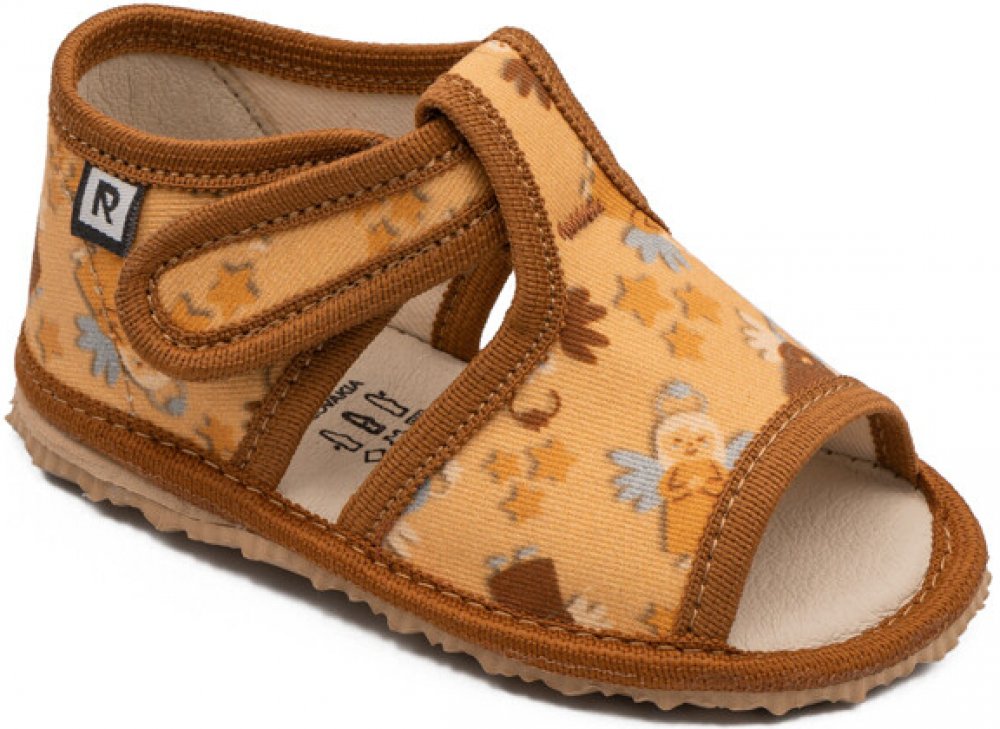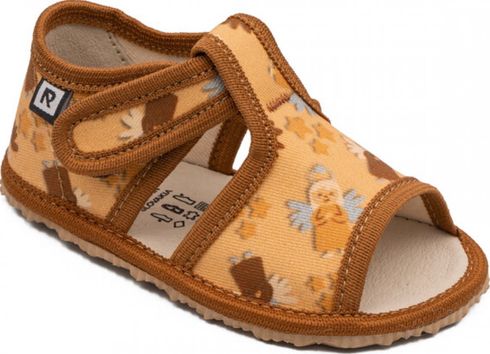 Dětská domácí obuv ze 100% bavlny a přírodní podšívkové kůže s prvky tzv. barefoot obuvi - výrazně flexibilní stélkou a podešví s nulovým dropem (rozdíl mezi výškou paty a špice oproti podložce je nula). Tento typ obuvi je vhodný do interiéru, ideální pro měkké resp. 3D povrchy, např. koberec, hrací podložky apod., krátkodobě i na hladké pevné povrchy. plovoucí podlahu, optimálně při střídání měkk...