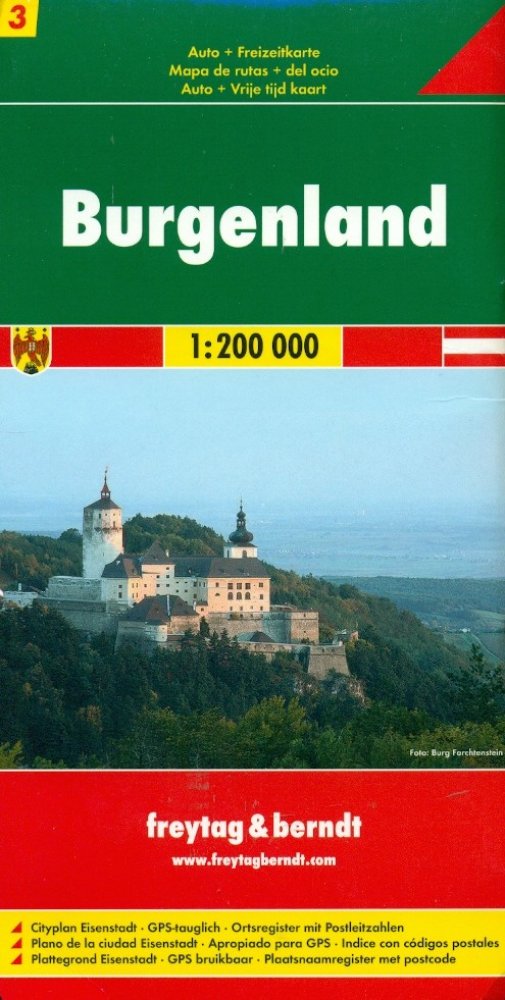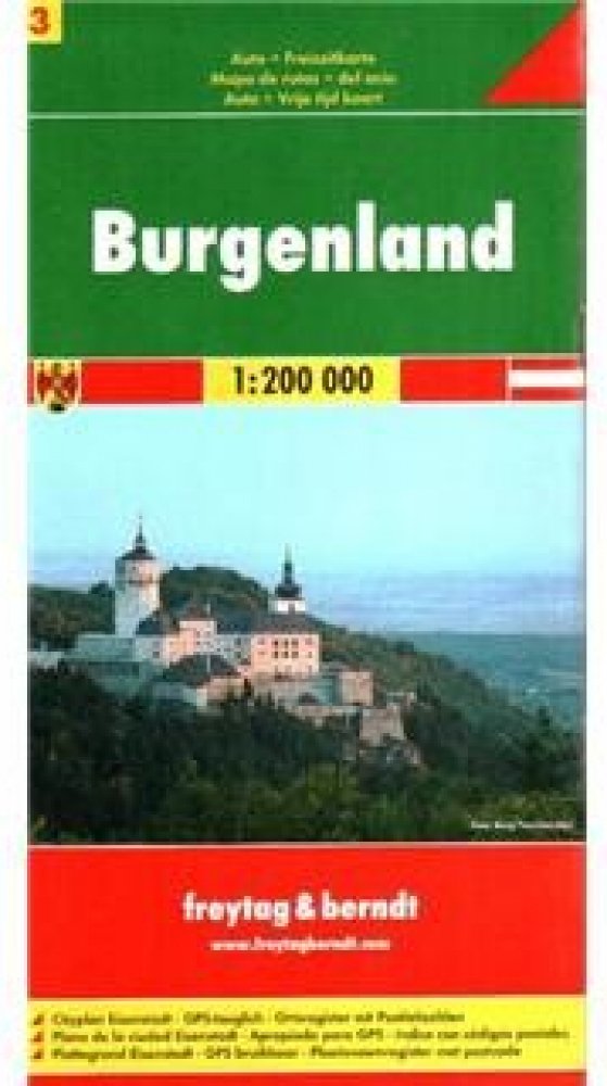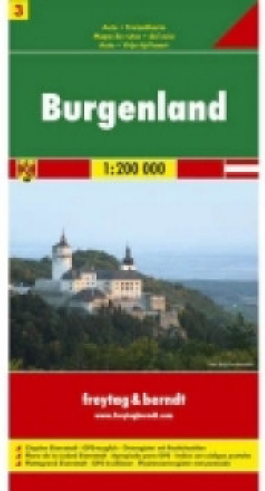 Jednostranná regionální automapa Burgenlandu. Mapa s bohatým turistickým obsahem je svým měřítkem vhodná pro poznávání regionu autem či na kole. Silniční síť je označena čísly komunikací, zvýrazněny placené úseky, nebezpečné klesání/stoupání, symbolické znaky pro benzínové stanice, odpočívadla, motely, kilometráž úseků. Vedle dopravních informací jsou zaznačeny přírodní rezervace, panoramatické cesty s krásnou vyhlídkou, cyklotrasy, kulturní zajímavosti, znaky pro tábořiště, kempy. Výškopis je v mapě vyznačen pomocí stínování. Mapa je kompatibilní s GPS. Přiložená brožura s rejstříkem sídel a turistickými informacemi. Česká legenda. Vydání: Z důvodu časté aktualizace map Vám dotaz na rok vydání rádi zodpovíme telefonicky či emailem. Děkujeme za pochopení.