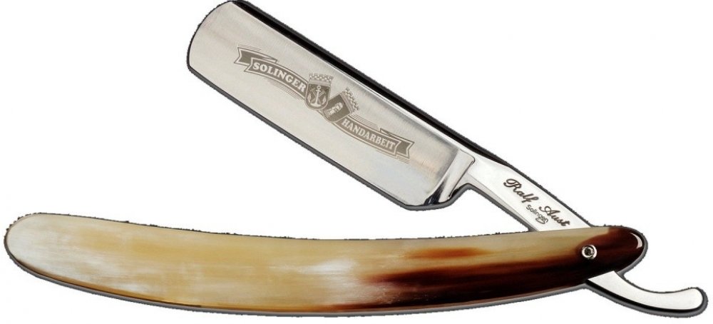 Kvalitní břitva Ralf Aust Solingen s 5/8 palcovou čepelí s lesklým povrchem z kvalitní uhlíkové ocele s vyleptaným logem. Rukojeť je vyrobena z rohoviny, díky níž je každý kus originál. Na krčku je vyražen výrobce. Tato břitva je vyráběna ručně v Německu. Dodáváno v černé krabičce.
