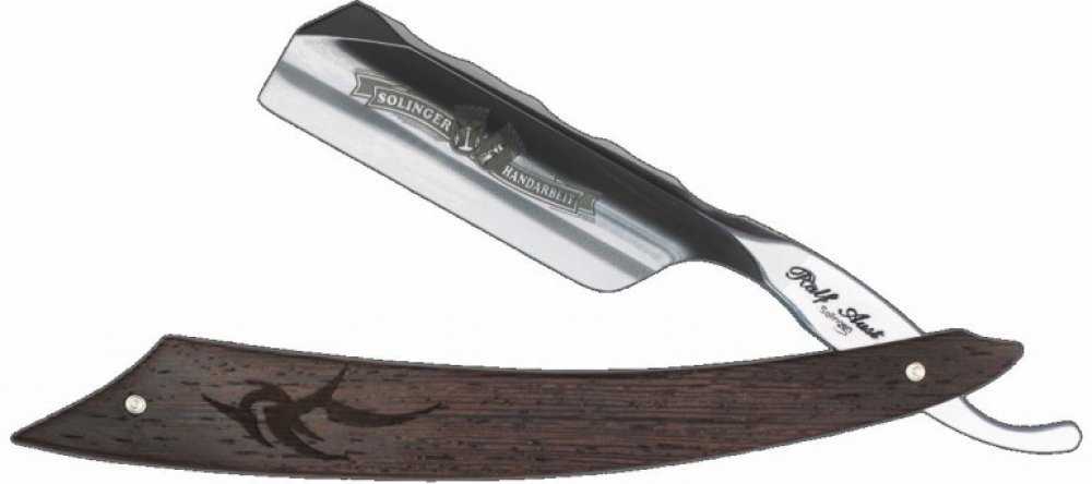 Kvalitní břitva Ralf Aust Solingen s 6/8 palcovou čepelí s americkou hlavou a s lesklým povrchem z kvalitní uhlíkové ocele s vyleptaným logem. Rukojeť v moderním tvaru je vyrobena ze dřeva Wenge. Na krčku je vyražen výrobce.