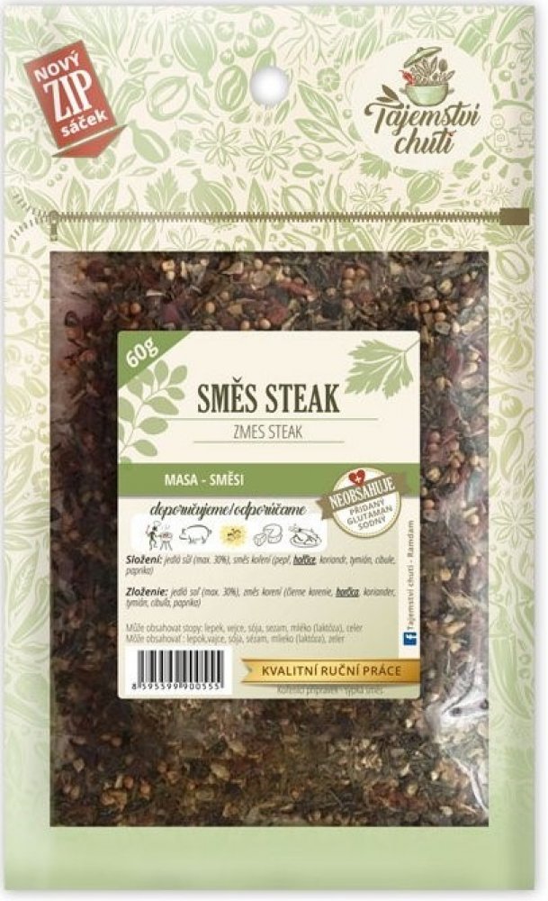 Vynikající steaková směs koření. Je to velmi bohatá a pikantní směs, zvlášť vhodná na nakládání masa, na dušená masa a zeleninové směsi. Použití: Kořenící přípravek pro masa, především steaky. Složení: Sůl max 30 %, směs koření (pepř, hořčice,koriandr, tymián, cibule, paprika.) Parametry produktu Země původu Česká republika Hmotnost 60 g Doba dodání 5 dnů