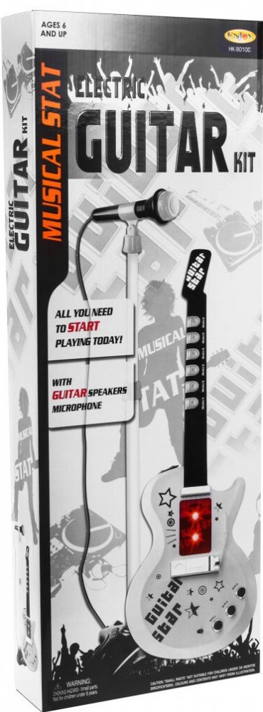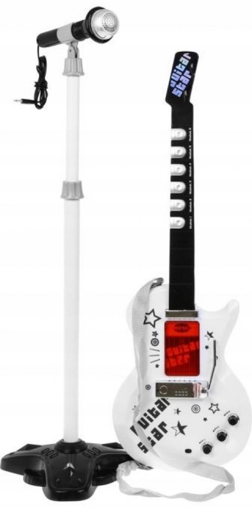 PopisELEKTRICKÁ KYTARA s mikrofonem Jedinečná elektrická kytara pro budoucí kytaristy s mikrofonem v balení.Kytara je nesmírně inspirativní hudební nástroj ze skupiny ošoupané struny, který hraje mimořádně důležitou roli v blues, country, flamencu, rocku a mnoha formách populární hudby.Již v prvních letech života dítěte projevuje zájem o hraní na hračky, tančí, zpívá a zkouší hrát na jednoduché nástroje.Přítomnost hudby ve vývoji dítěte má rozhodně pozitivní vliv.Talent odhalený v tak raném stádiu má šanci se v budoucnu výrazně rozvinout, proto by tento okamžik neměl být promarněn.Pokud se vaše dítě dívá na kytaristy s nepředstavitelným potěšením, předstírá, že hraje na imaginární kytaru, a má smysl pro rytmus - pak může mít talent pro hru na jakoukoli kytaru.Hračka obsahuje 6 kovových strun, 3 kytarové tóny, 7 melodií a 12 krátkých sól.Obsah sady - kytara s nastavitelným popruhem (napájena 3 bateriemi AA 3 x 1,5 V - nejsou součástí balení),- mikrofon se zesilovačem hlasu- nastavitelný stojan (2 úrovně),- nastavení úrovně mikrofonu,- kabel pro MP3,Rozměry - kytara cca 70 cm x 24 cm x 4 cm- mikrofon cca 20 cm x 5 cm- stojan cca 64 až cca 110 cm,