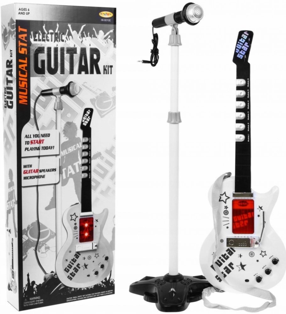 PopisELEKTRICKÁ KYTARA s mikrofonem Jedinečná elektrická kytara pro budoucí kytaristy s mikrofonem v balení.Kytara je nesmírně inspirativní hudební nástroj ze skupiny ošoupané struny, který hraje mimořádně důležitou roli v blues, country, flamencu, rocku a mnoha formách populární hudby.Již v prvních letech života dítěte projevuje zájem o hraní na hračky, tančí, zpívá a zkouší hrát na jednoduché n...