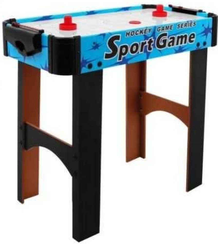 Sada Air Hockey CYMBERGAJ (A0015).Popis hryAIR HOCKEY - je typ populární arkádové hry určené pro dva hráče.Pro hru se používá speciálně připravený stůl.Povrch stolu je pokrytý otvory, kterými je vháněn vzduch.Tím se vytvoří vzduchový polštář, po kterém puk klouže bez kontaktu se zemí.Principy hryHráči stojí na opačných stranách stolu.Každý hráč používá speciální plastový nástroj, někdy nazývaný hřib, který funguje jako raketa.S tímto nástrojem hráči odpalují puk.Cílem hry je umístit puk do soupeřovy branky.Puk se pohybuje velkou rychlostí.Hra je zpravidla ukončena, když některý z hráčů dosáhne předem stanoveného počtu bodů (obvykle sedm nebo devět) nebo po uplynutí stanoveného časového limitu.Obsah sady- herní stůl z laminované 12mm MDF desky,- dmychadlo umístěné pod stolem je napájeno bateriemi typu AA (6 x 1,5 V - nejsou součástí balení),- 2 houby na hraní,- 2 disky na hraní.RozměryRozměry stolu: 65 cm x 30,5 cm x 60,5 cm,.