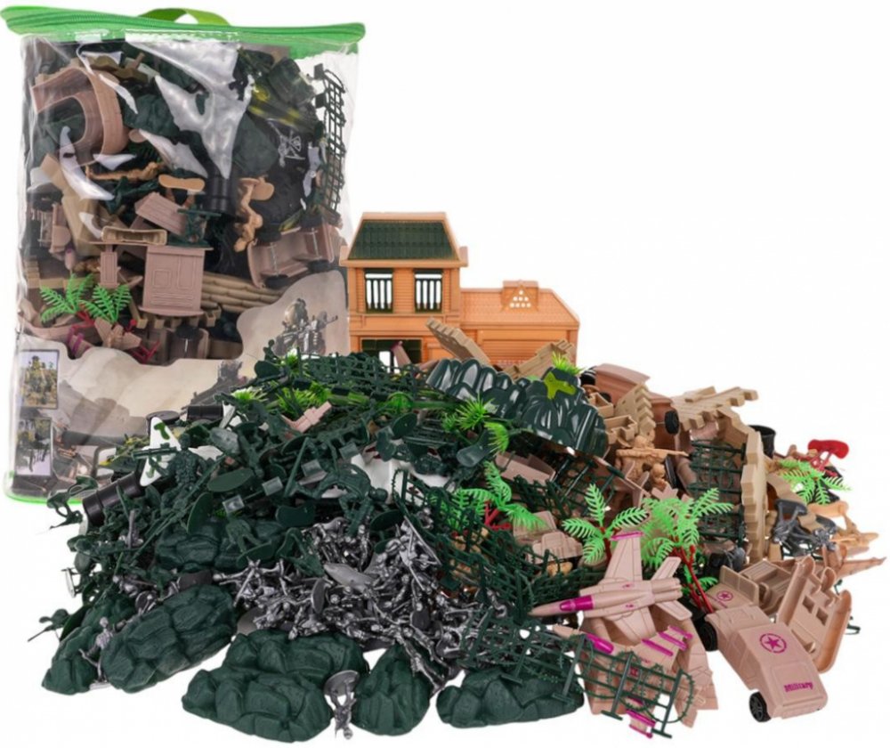 Popis Sada vojáků a vojenských vozidel Dobře vybavená sada vojenských figurek, vozidel pro děti od 3 let. Sada obsahuje až 400 prvků. Sada je ideální pro hraní samostatně nebo ve skupině. Sada obsahuje 250 vojáků ve 3 barvách a 2 velikostech, vozidla: tanky, obrněná auta, terénní vozidla, letadla, lodě, bezpečnostní základnu, zákopy, obranné skály, zdi, pytle s pískem, ploty s ostnatým drátem a ...