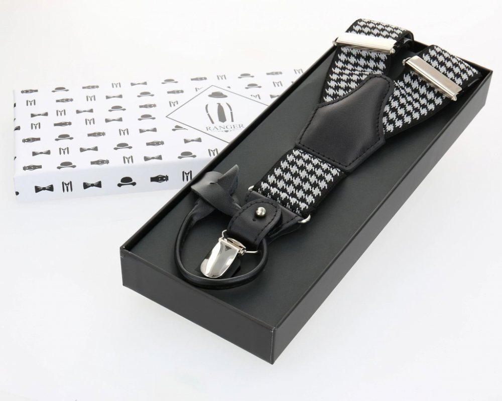 Pánské šle v černobílé barvě se vzorem kohoutí stopy jsou určeny pro všechny příznivce originálních doplňků jako stylový dárek. Šle jsou s nastavitelnou délkou 120 cm, šíře 3,5 cm v provedení ve tvaru písmene "X" s uchycením na žabky nebo na knoflíky – podle Vašeho výběru.