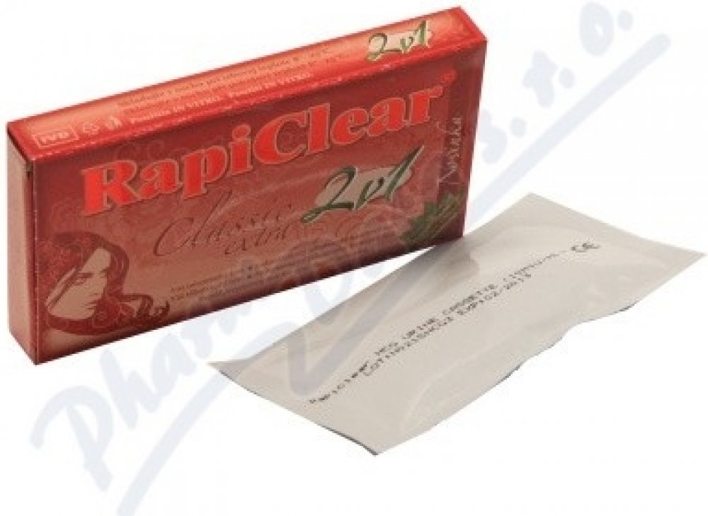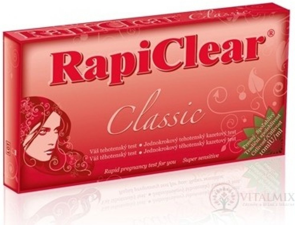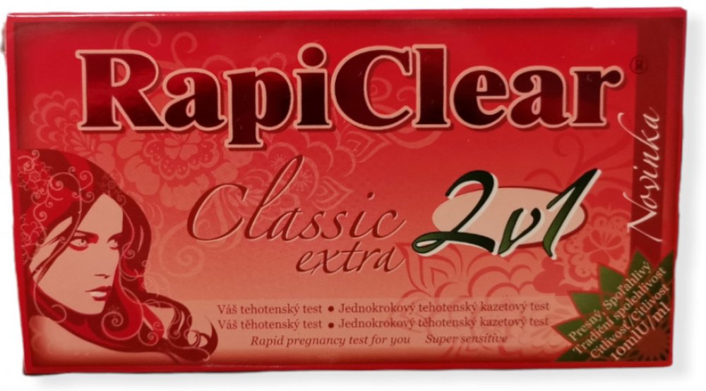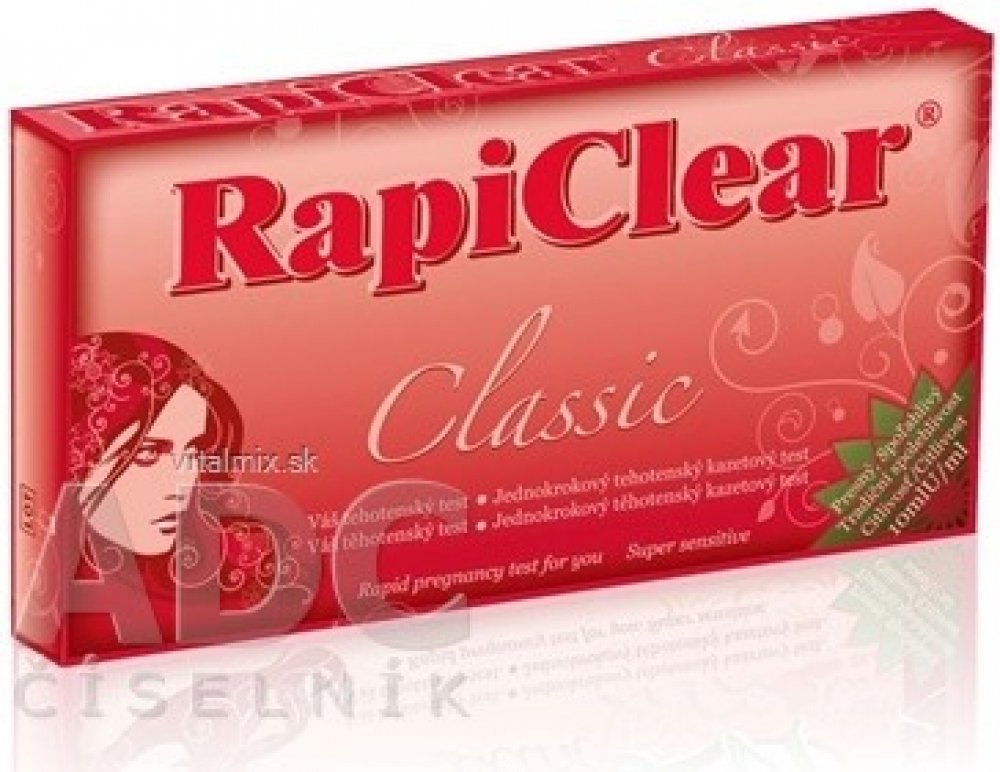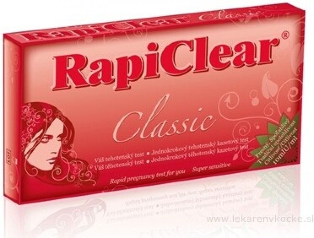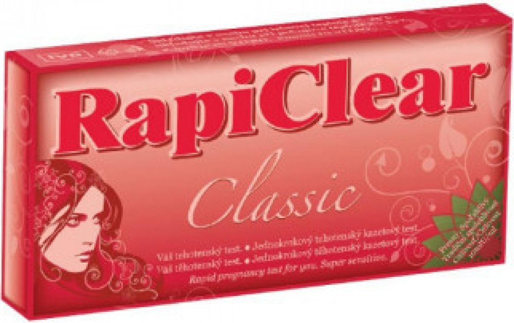 Těhotenský test RapiClear Classic Super Sensitive je vysoce kvalitní a velmi jednoduše použitelný těhotenský test. Test může stanovit těhotenství už pátý den po oplodnění bez čekání na termín menstruace, v závislosti na velikosti hladiny těhotenského hormonu hCG) v moči. Test je možné použít celých 24 hodin, není potřebná ranní moč.