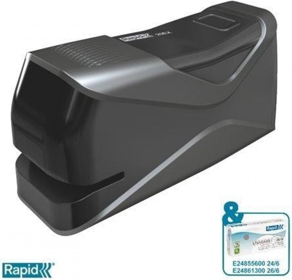 Kompaktní elektrická sešívačka pro použití v kanceláři, recepci či domácnosti. Napájení po Kompaktní elektrická sešívačka pro použití v kanceláři, recepci či domácnosti. Napájení pomocí adaptéru (součástí balení), jednoduché ovládání jednou rukou. Přední otvírání pro snadné doplnění drátků. Sešije až 20 listů papíru (80 gsm). Pohodlné ovládání jednou rukou. Napájení pomocí adaptéru (součástí balení). Na drátky Rapid Strong 24 6 a 26 6. Hloubka vkládání 10 mm. Záruka 2 roky (při používání drátků Rapid). . . . . .