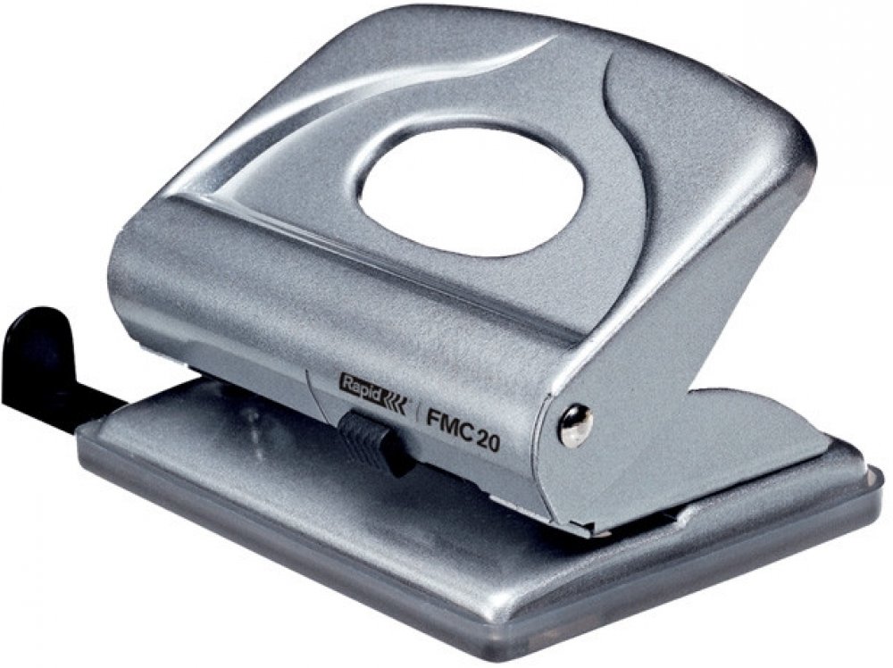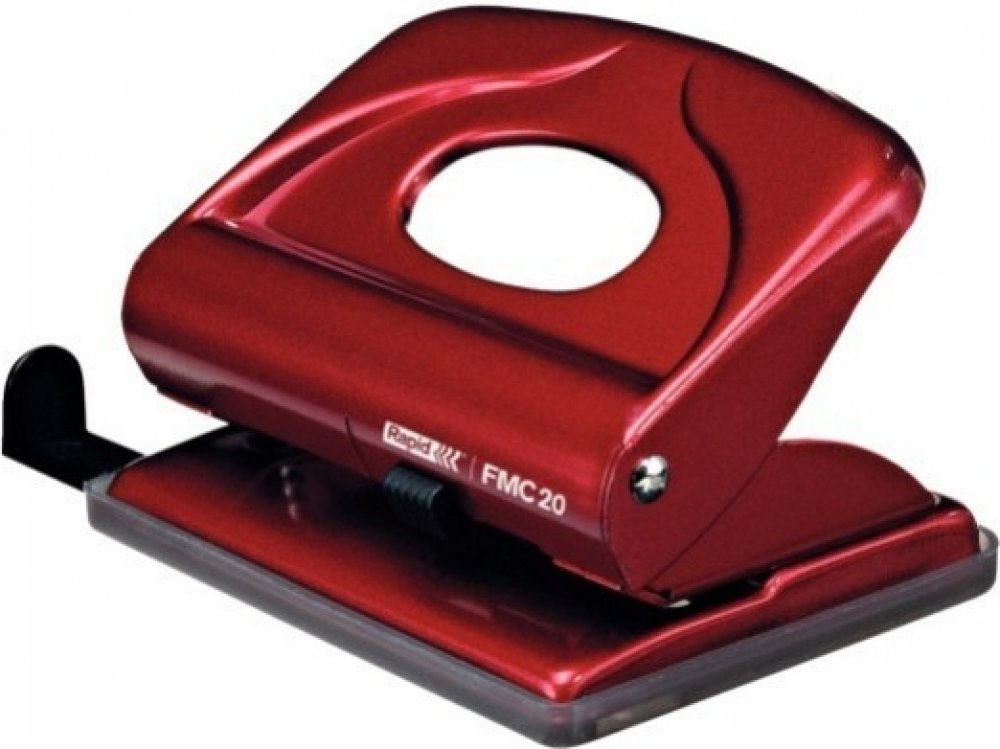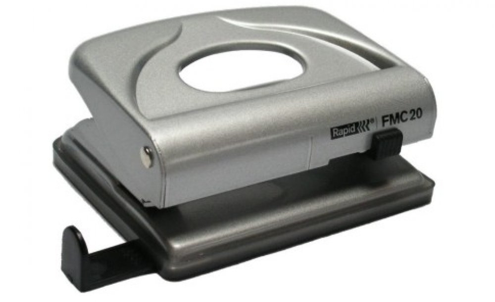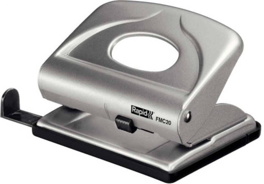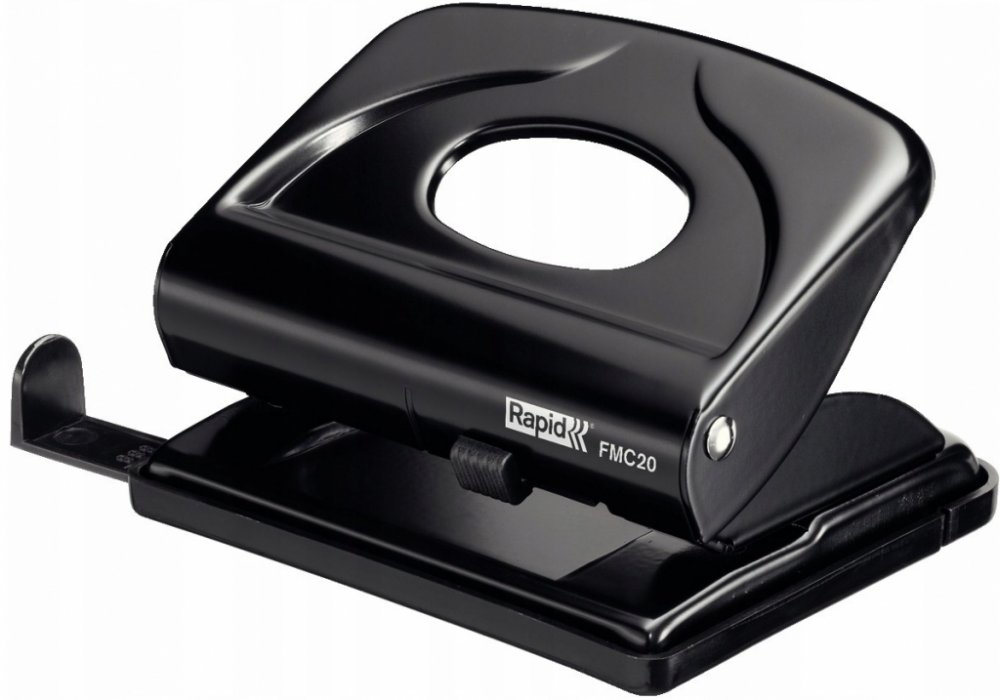 Kovová děrovačka s příložníkem a uzamykatelným ramenem pro snadné skladování. Vhodná pro domácnosti a kanceláře.