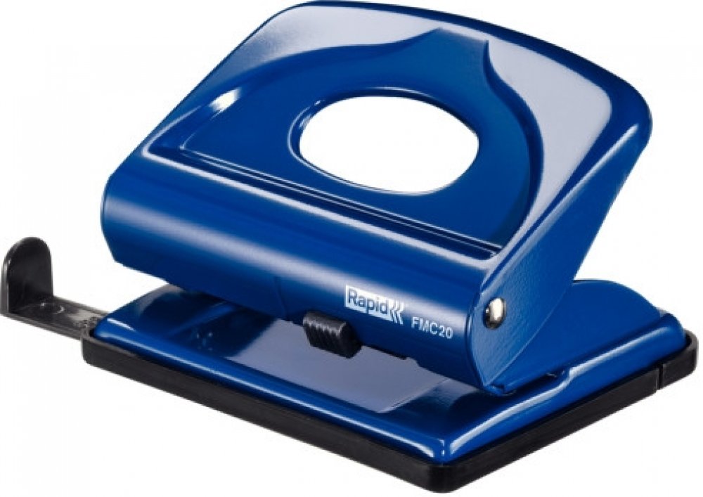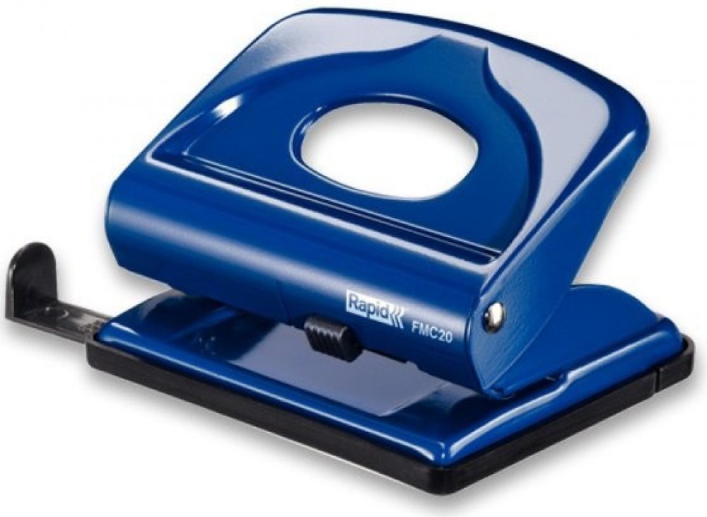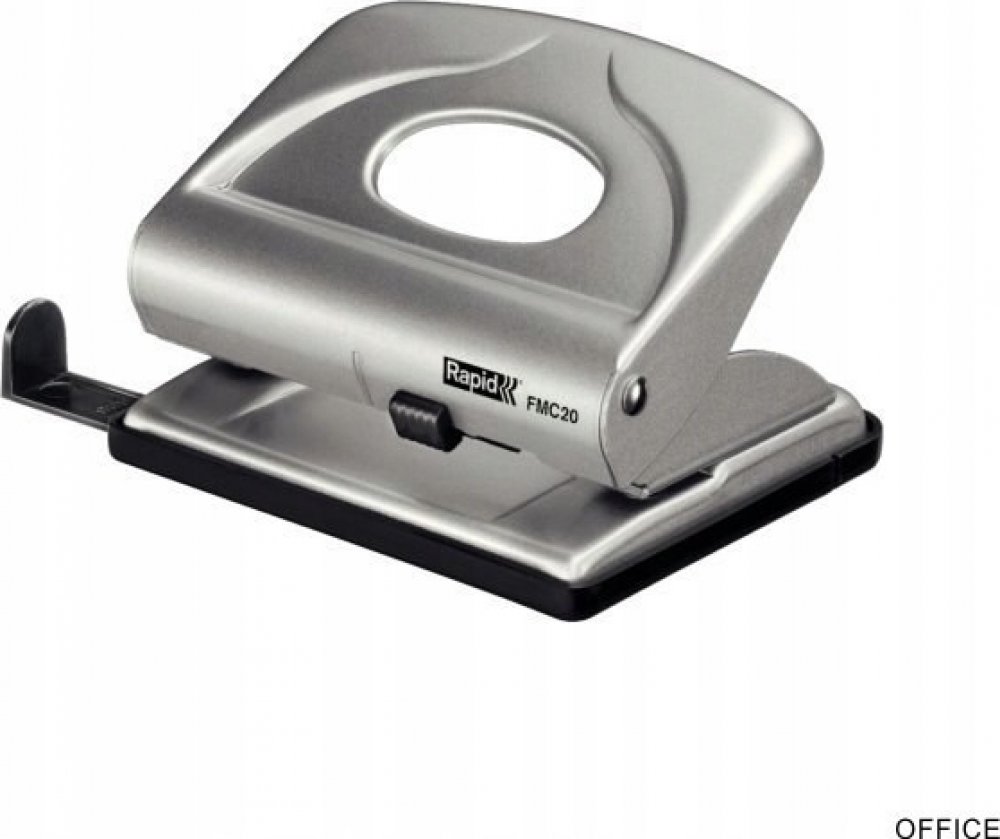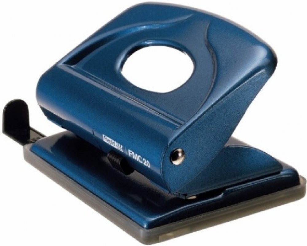 Kovová děrovačka s příložníkem a uzamykatelným ramenem pro snadné skladování. Vhodná pro domácnosti a kanceláře.