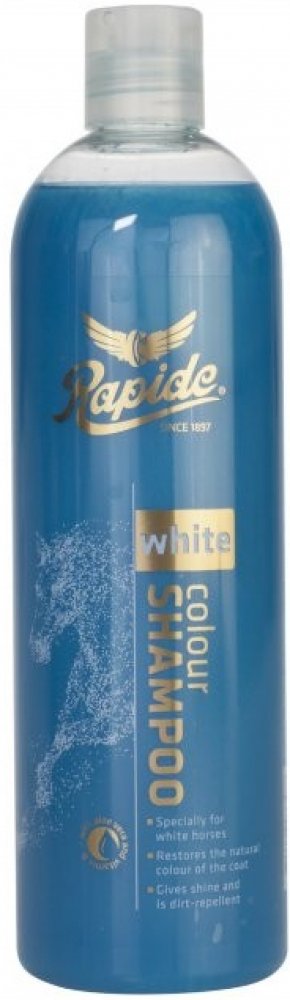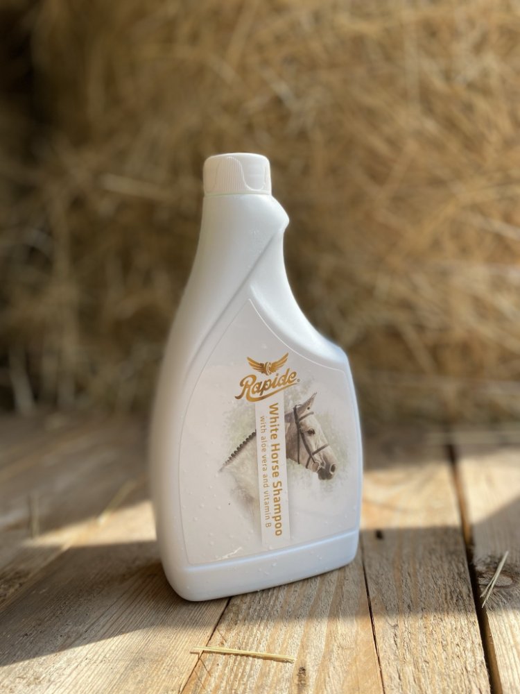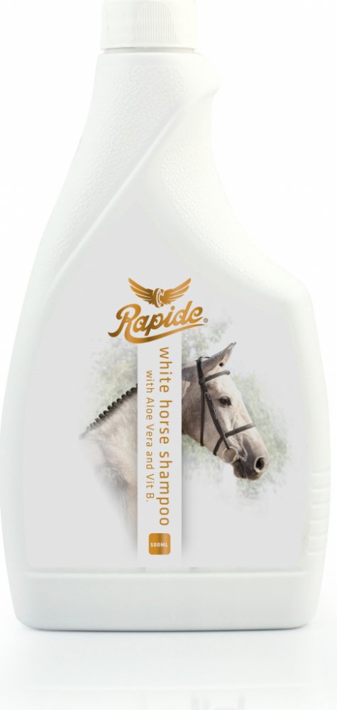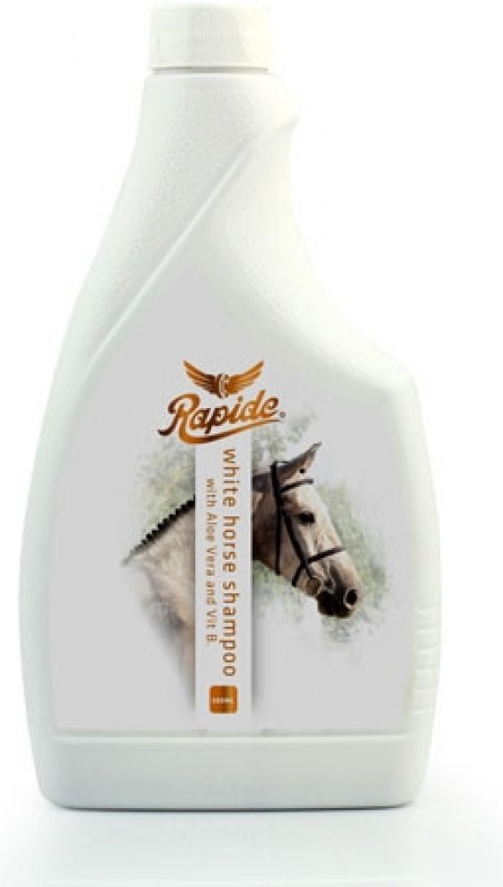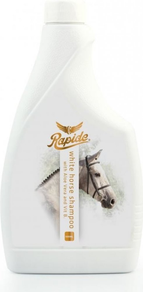 Šampon pro světlé koně s Aloe Vera a vitamínem B. Rapide White Horse Shampoo je šampon s obsahem aloe vera, vitamínu B a dalších unikátních přírodních složek, který byl vyvinut speciálně pro bílé/světlé koně. Navrací elasticitu a nádherný lesk srsti vašeho koně. Odstraňuje nečistoty a oživuje bílou/světlou barvu srsti koně. Pro dokonalé čištění a optimální vzhled.
