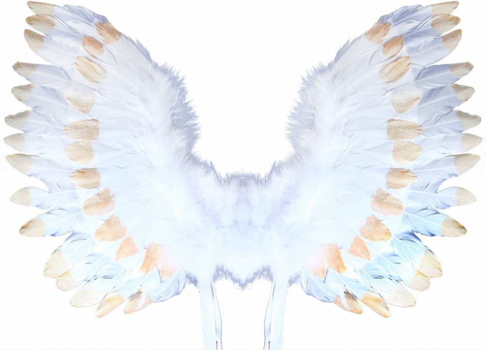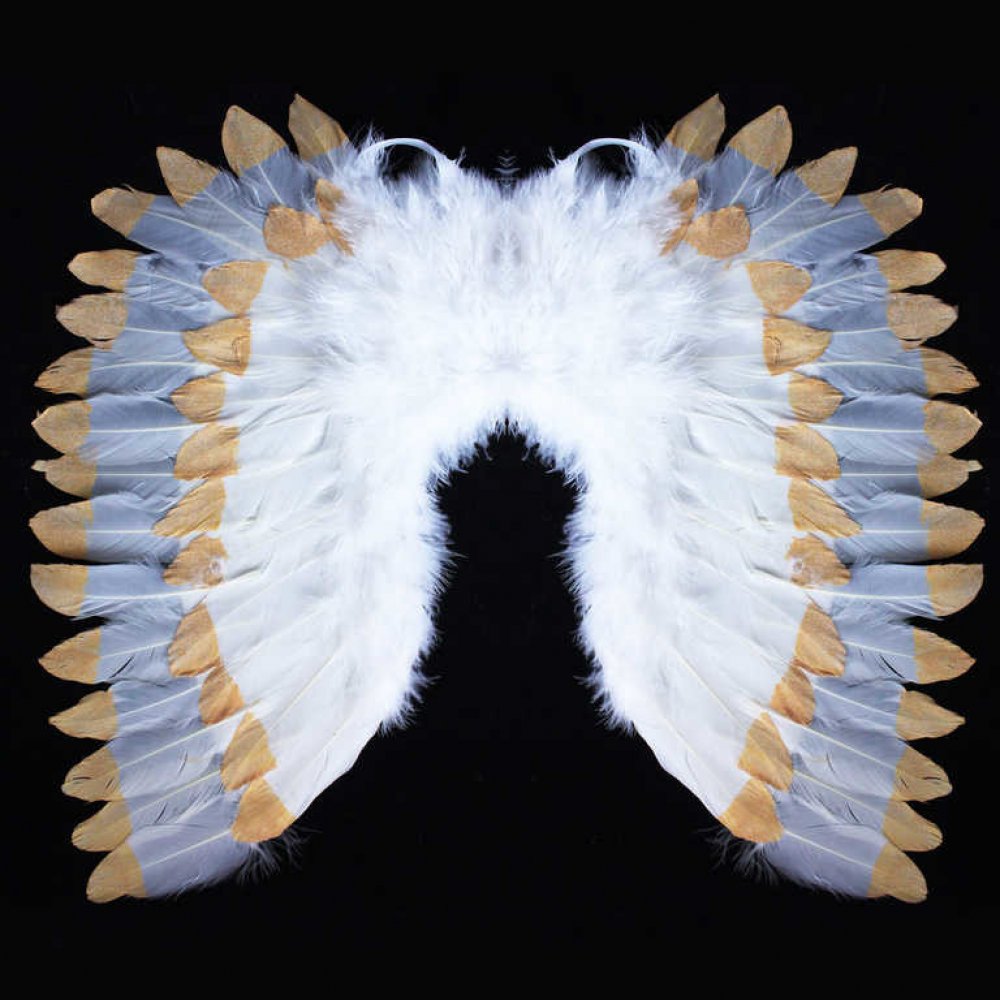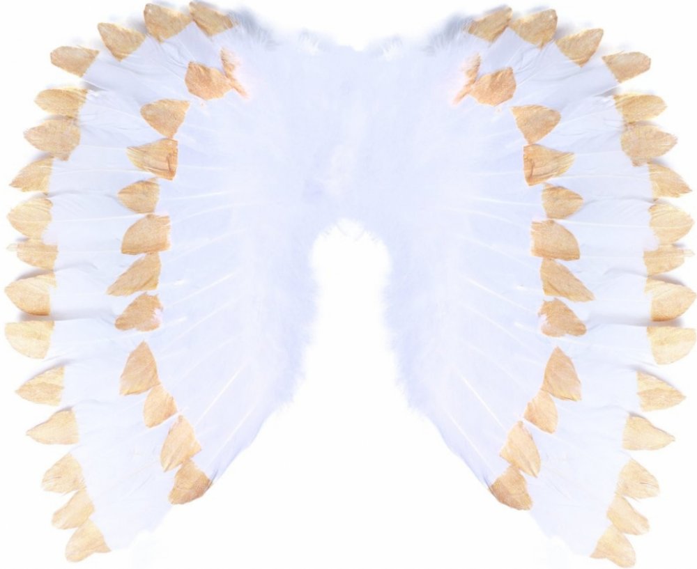 Krásná křídla pro opravdové anděly se sněhově bílým peřím zdobeným zlatými třpytkami.