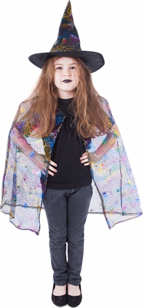 Krásná sada na čarodějnice nebo halloweenský večírek! Komplet obsahuje plášť a perfektně sladěný klobouk. Vše je dekorováno metalickými, magickými motivy různých barev. Doporučeno pro děti ve věkovém rozmezí 3-10 let (104-150 cm).