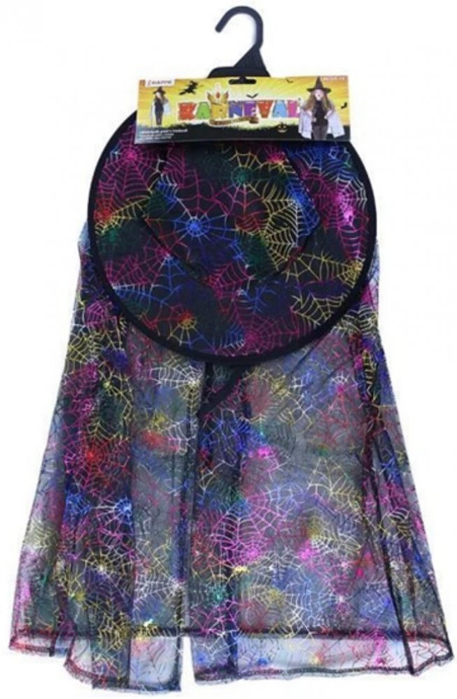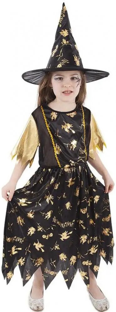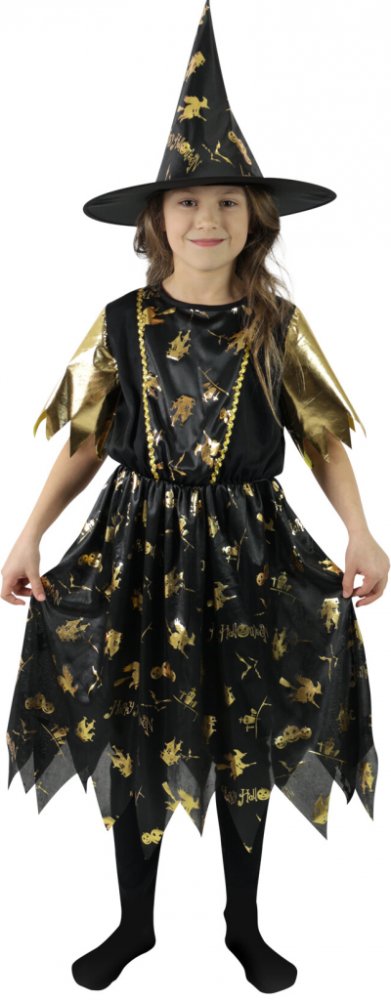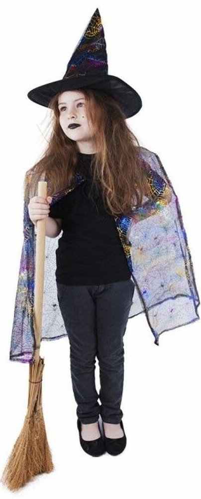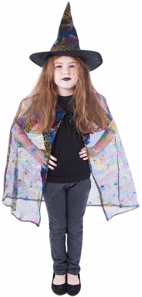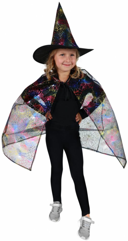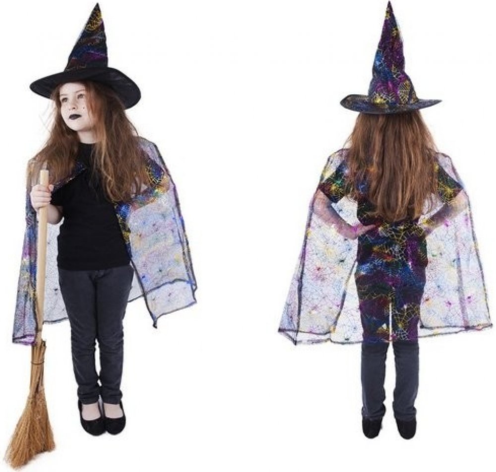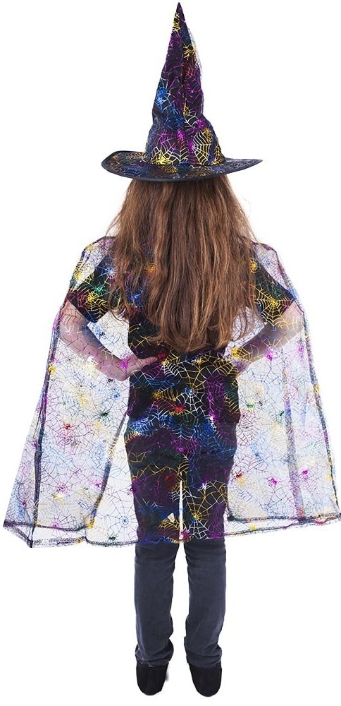 Krásná sada na čarodějnice nebo halloweenský večírek! Komplet obsahuje plášť a perfektně sladěný klobouk. Vše je dekorováno metalickými magickými motivy různých barev. Doporučeno pro výšku dítěte 104-150cm.