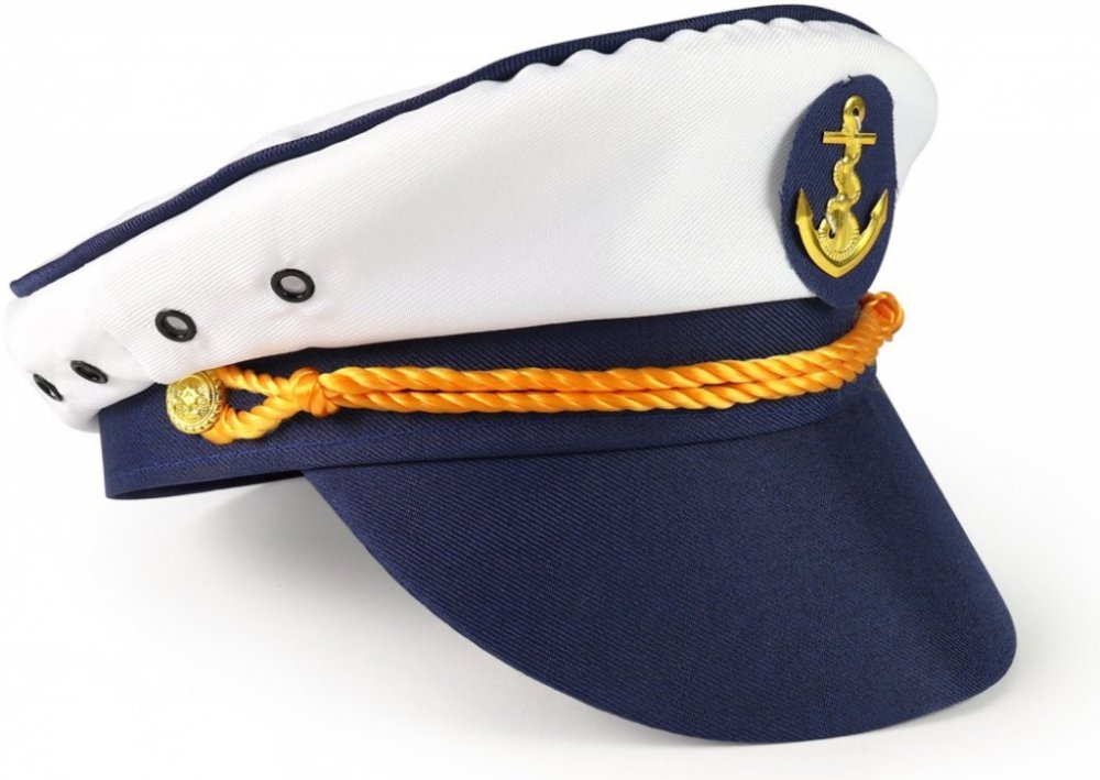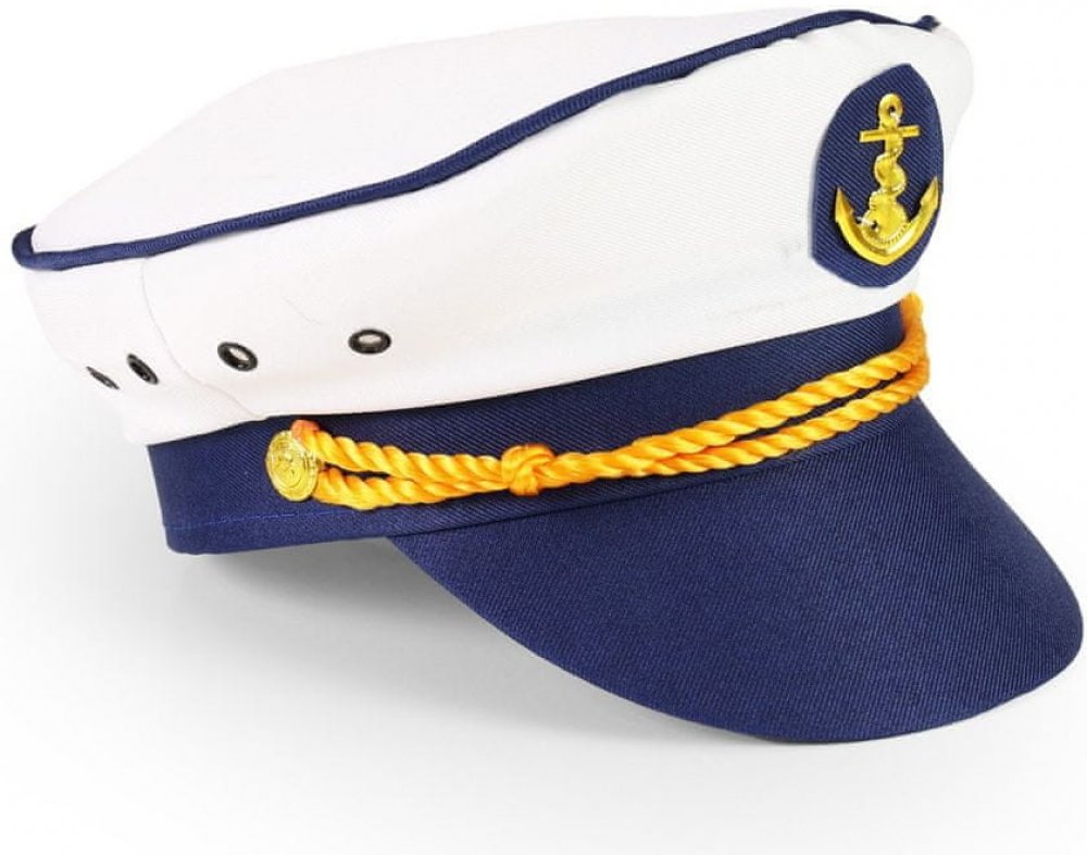 Parádní bílá čepice s modrým kšiltem a lemováním ve stylu námořníka pro dospělé! Tento senzační kousek je zdoben zlatým odznakem na přední straně čepice. Staňte se hvězdou karnevalového večírku díky této nepřehlédnutelné čepici a ohromte tak všechny své přátele!