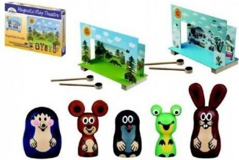 Balení obsahuje divadélko, dvě dřevěné paličky s magnetkami a 5 magnetických postaviček ze slavného dětského seriálu Krtek.