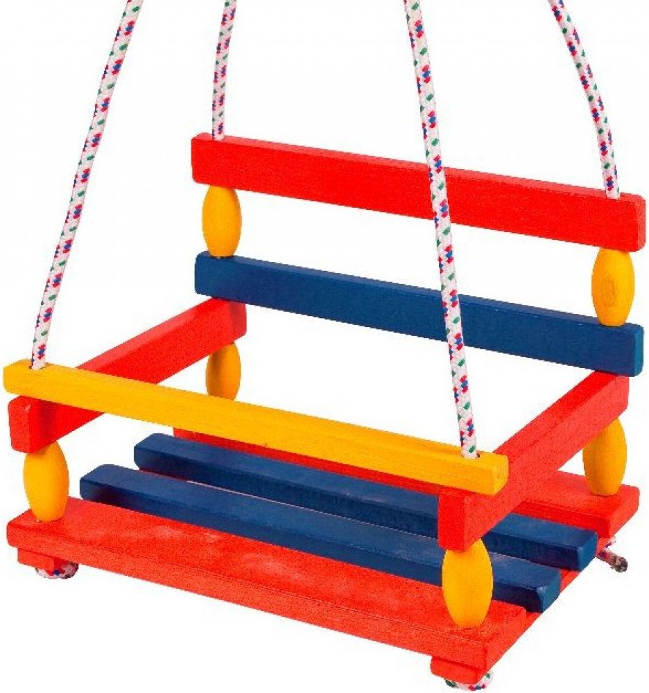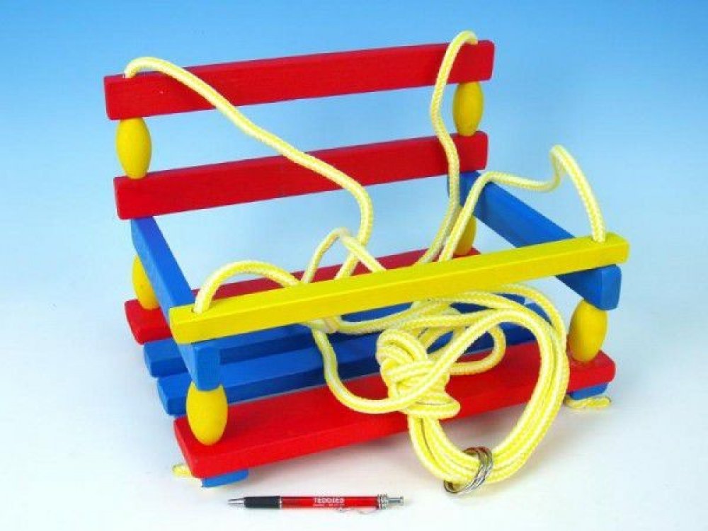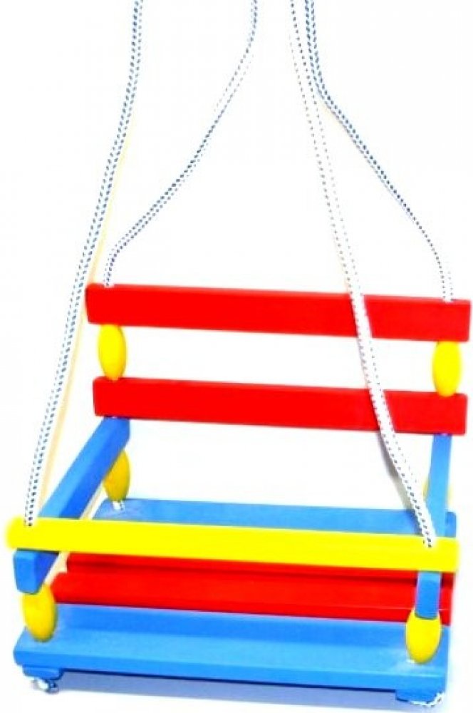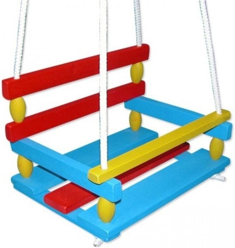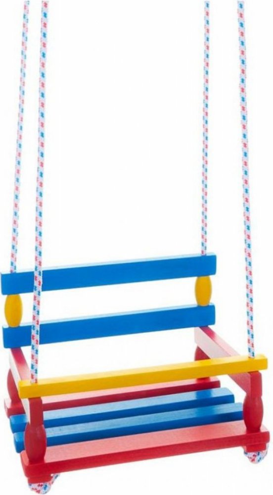 Krásná dřevěná barevná houpačka. Vhodná pro použití doma i na zahradě. Houpačka je bezpečná a stabilní.