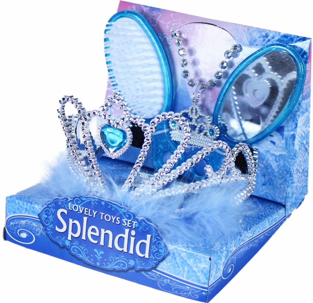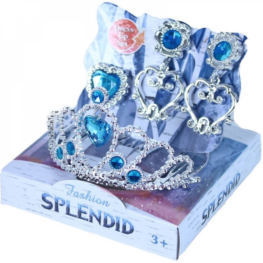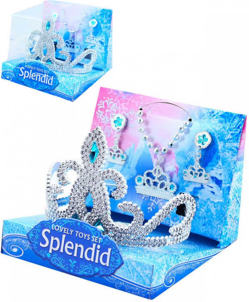 Krásná stříbrná korunka s náušnicemi, náhrdelníkem a prstýnkem pro všechny princezny nebo ledové královny. Doplňky jsou zdobeny modrými prvky. Perfektní sada ke kostýmu! Doporučeno pro děvčata od 3 let.