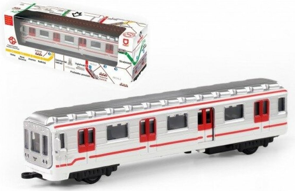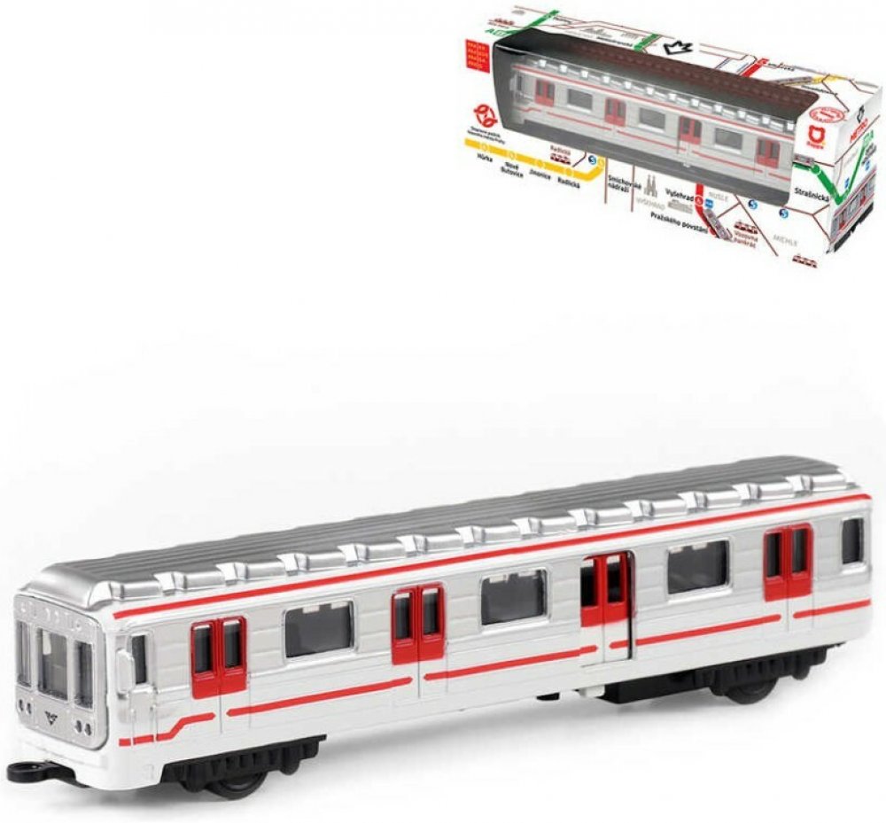 Originální hračka vytvořená ve spolupráci s hlavním městem Praha a Dopravním podnikem hlavního města Prahy. Délka metra je 16 cm. Tento jedinečný kousek se určitě stane oblíbenou hračkou všech malých nadšenců městské hromadné dopravy nejen v Praze. Navíc lze jednotlivé soupravy jednoduše zapojit za sebou. Jedny dveře metra je možné otevřít, pomocí páčky ve spodní části vozu. Jezdí na zpětný setrva...