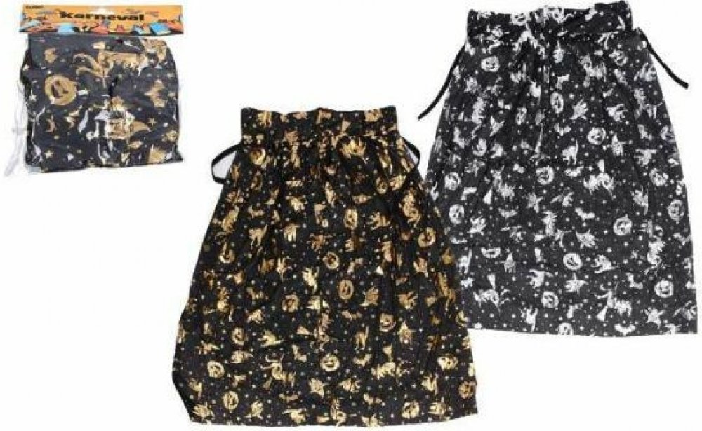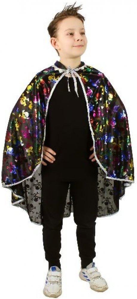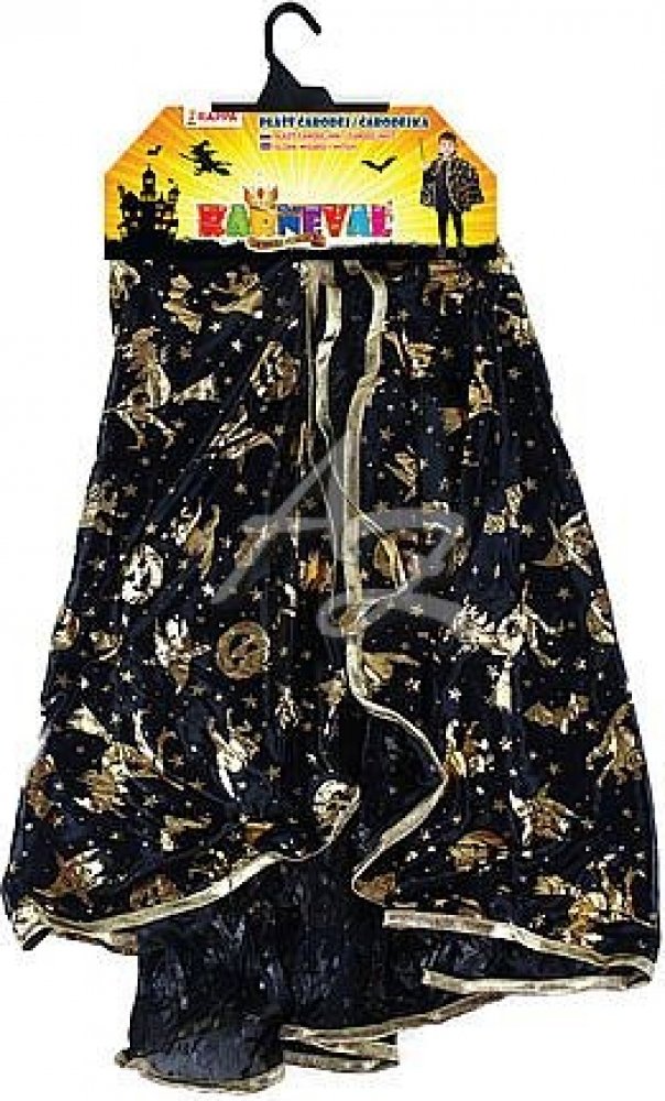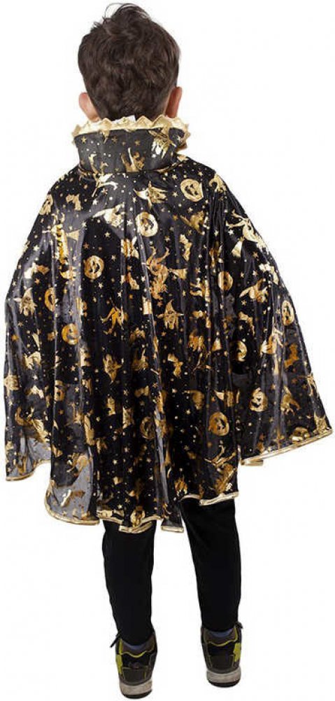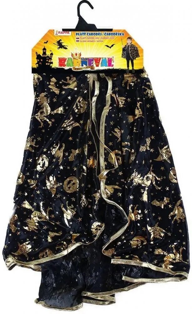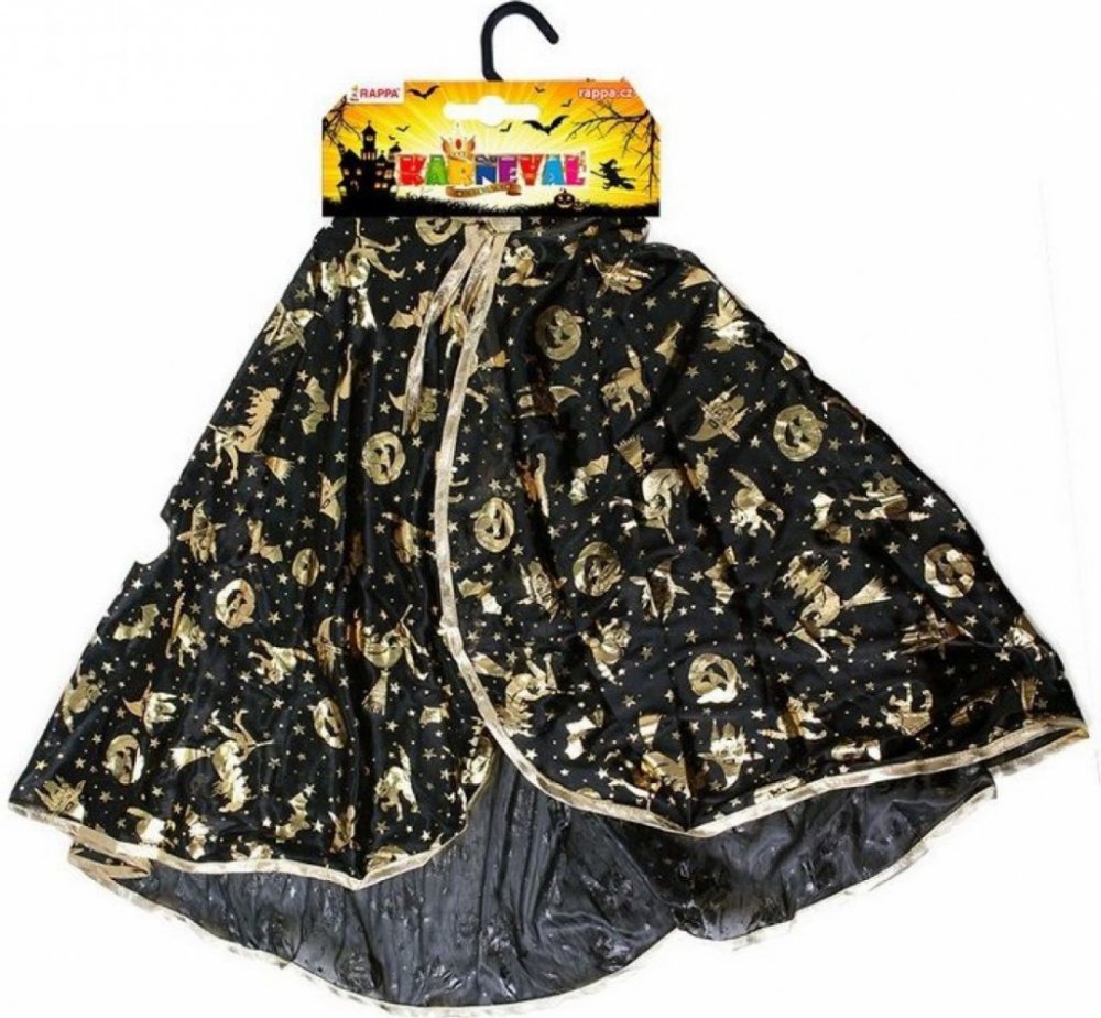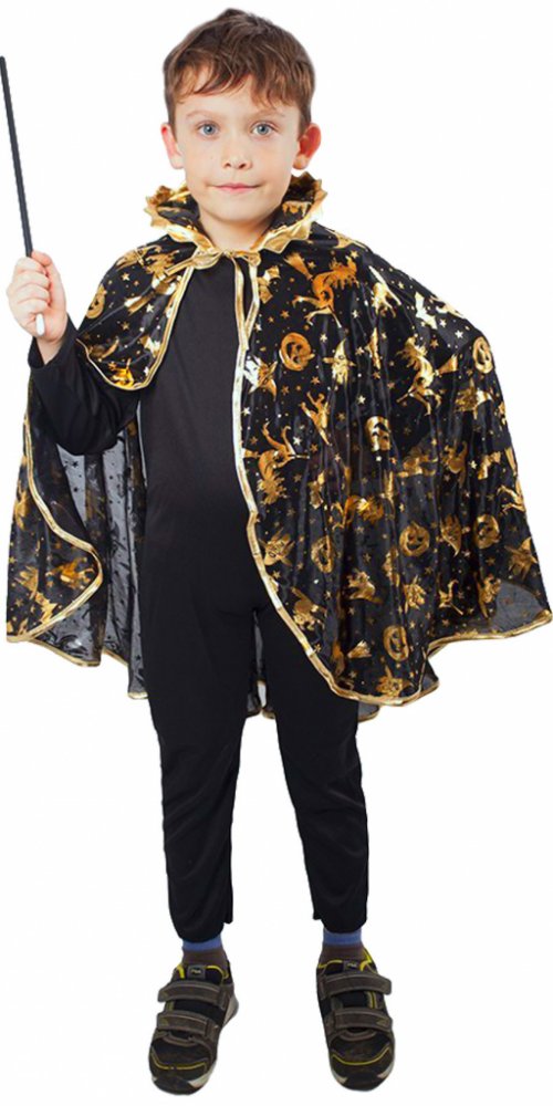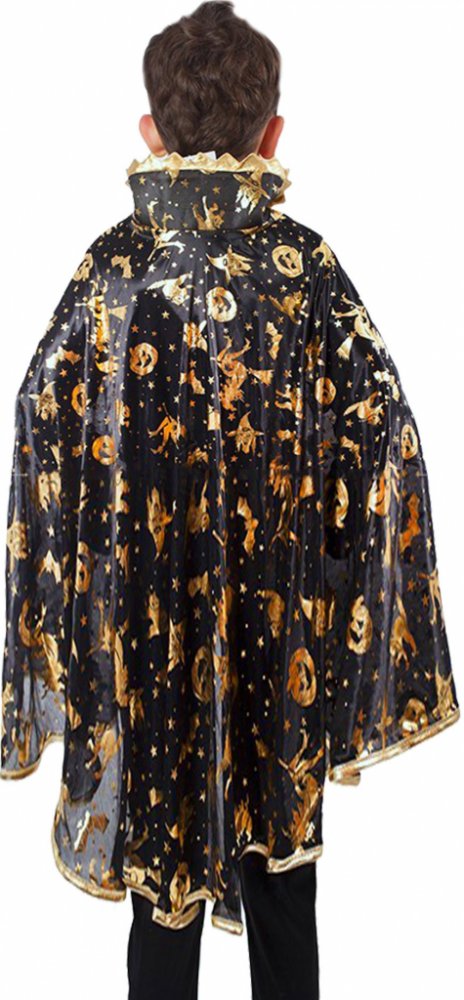 Krásný plášť na karneval nebo Halloween! Černý plášť je dekorován halloweenskými motivy zlaté barvy. Senzace! Doporučeno pro děti ve věkovém rozmezí 3-10 let.