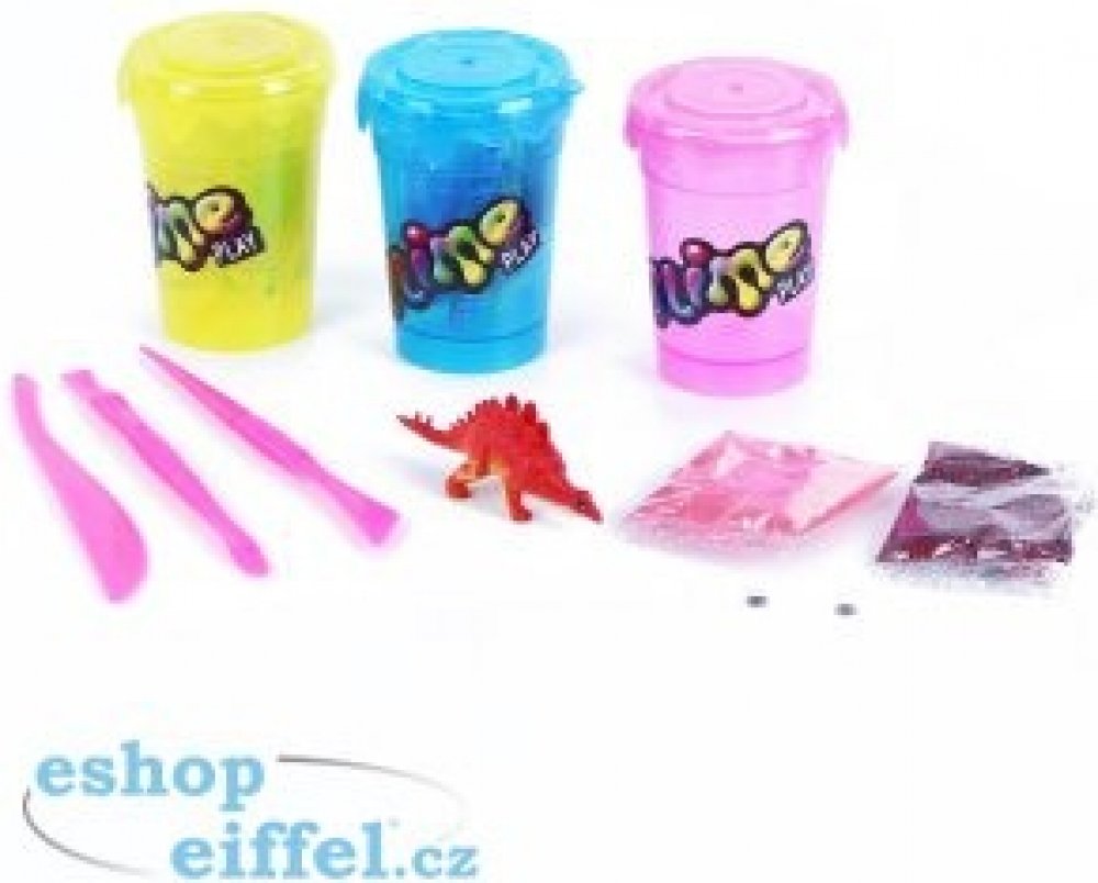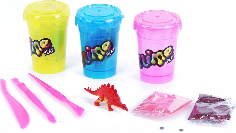 V každém z nich je plastový dinosaurus, prášek na výrobu slizu a třpytky.