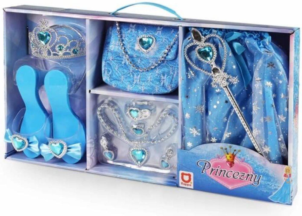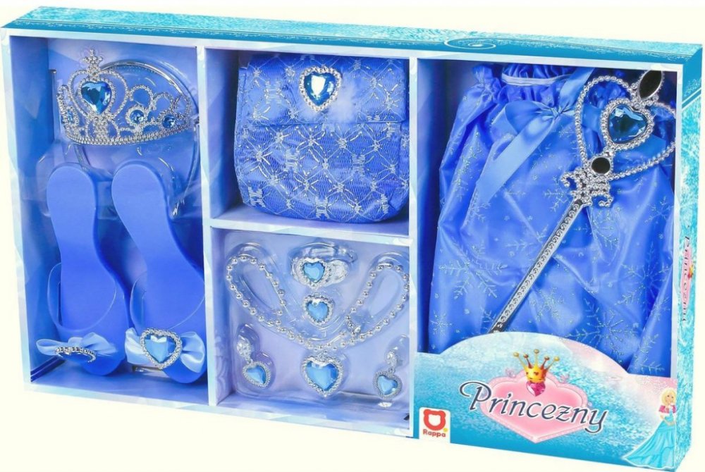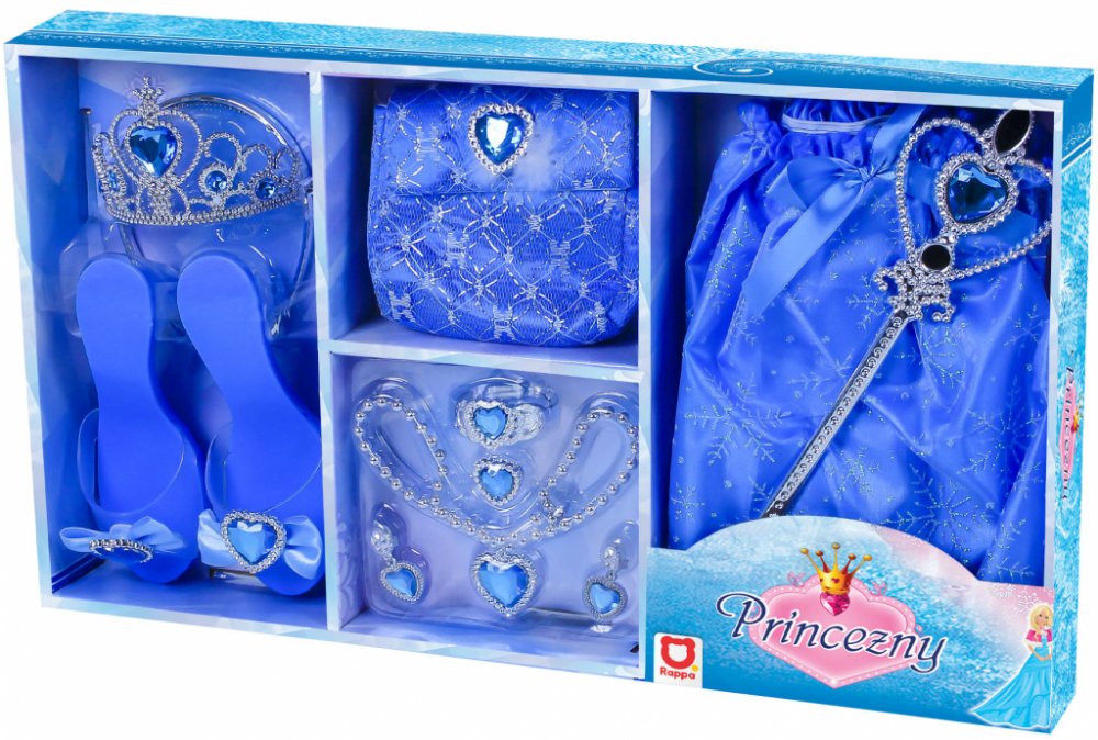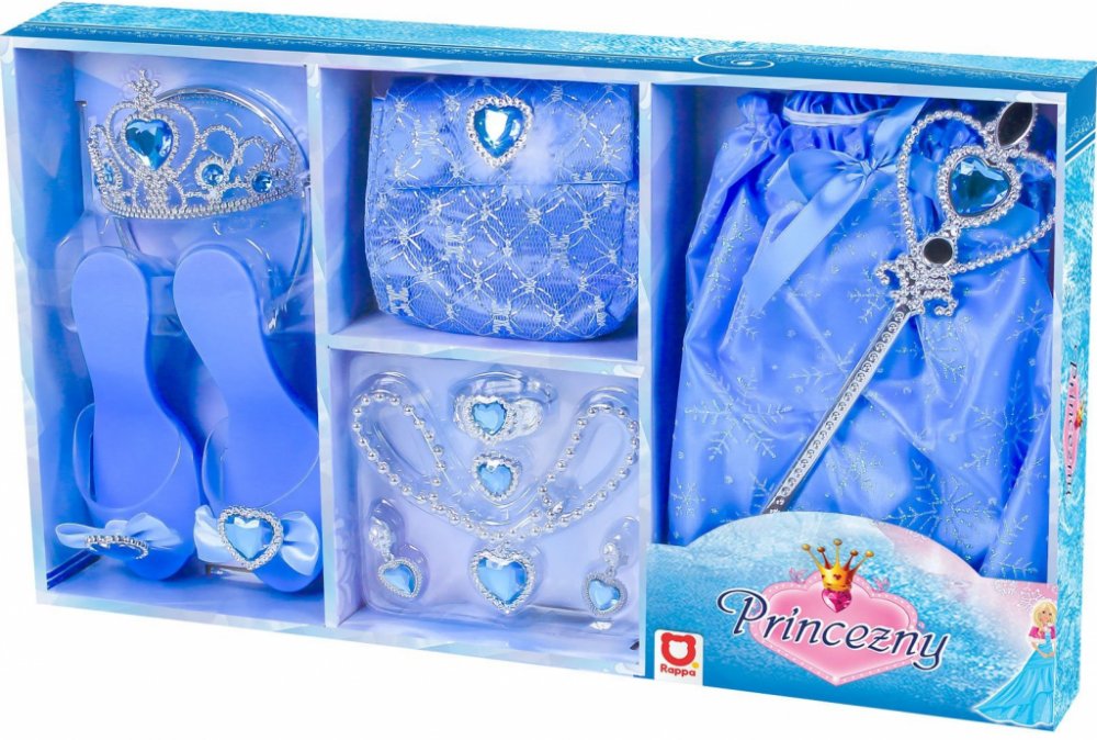 Karnevalová sada v modrém provedení pro každou malou princeznu. Součástí balení je vše, co každá správná princezna potřebuje. Jsou to střevíčky, korunka, kabelka a další nezbytné doplňky. Baleno v krabici.