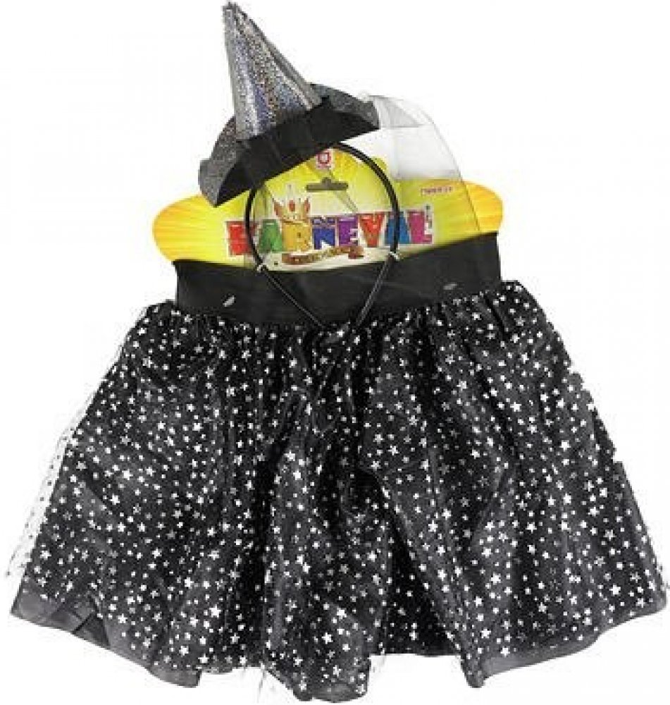 Bezva sada pro všechny malé parádnice čarodějnice! Sukýnka má černou spodničku, překrytou tylem s potiskem stříbrných hvězdiček. Je určena pro holčičky ve věkovém rozmezí 3-7 let. Délka sukně je 28 cm. Set je doplněn o čelenku s kloboučkem, který perfektně ladí k sukýnce. Skvěle se hodí i na oslavu Halloweenu nebo karneval!