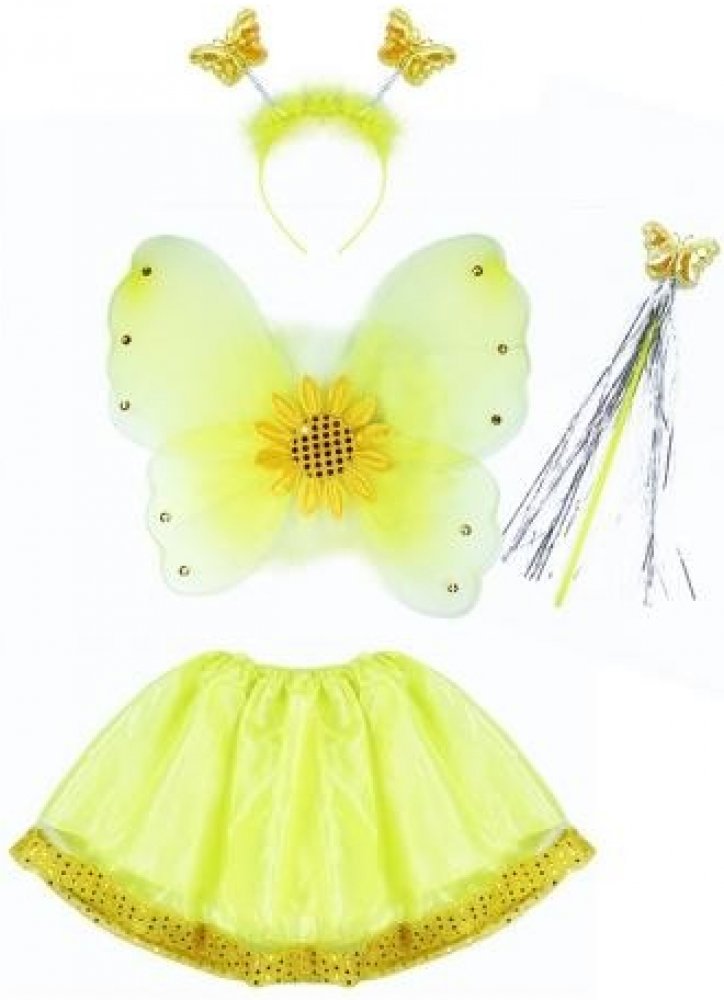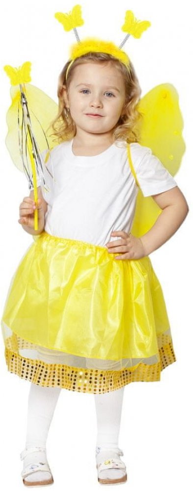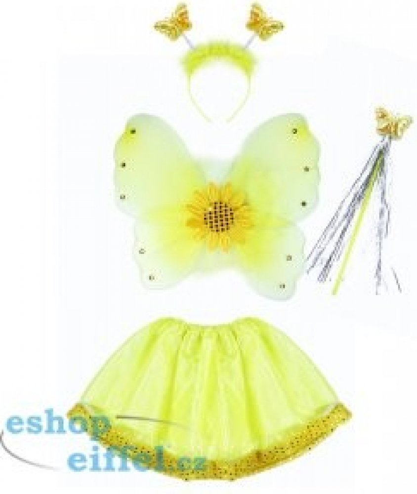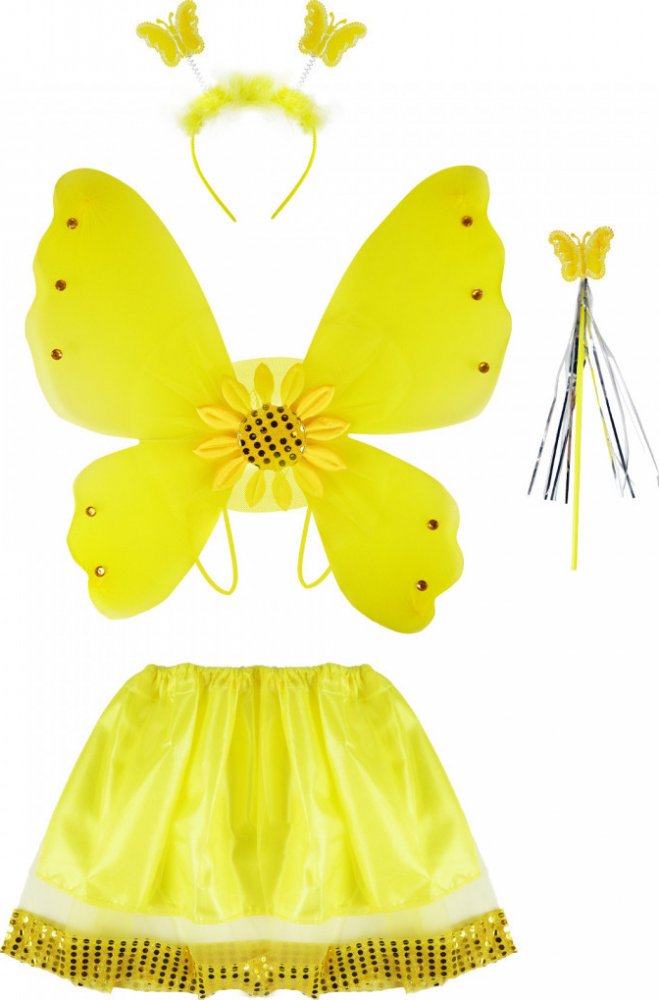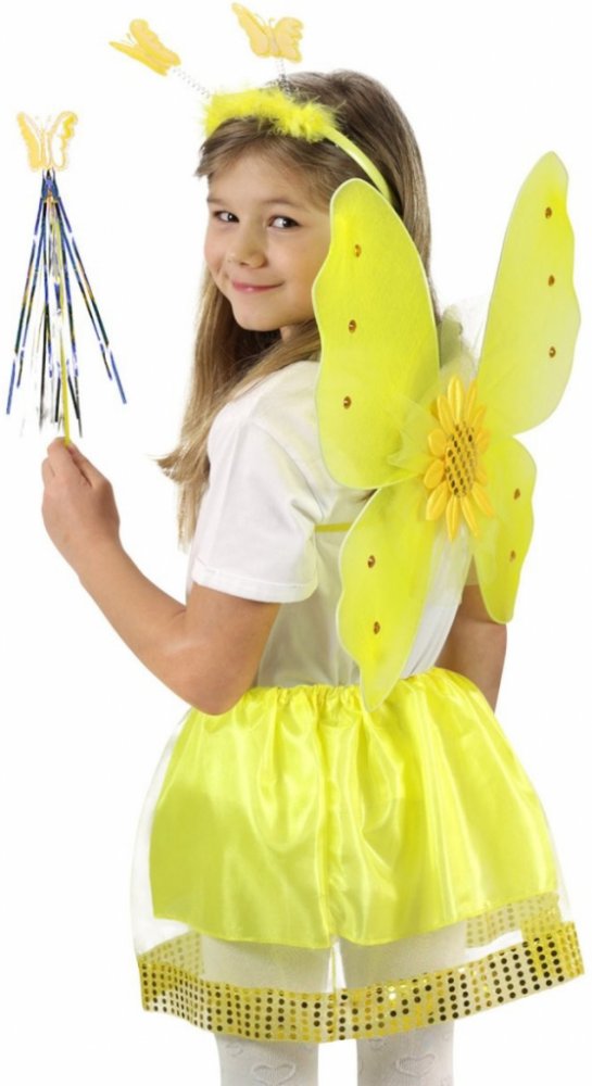 RAPPA - Dětský kostým Slunečnice s křídly Kostým ve stylu slunečnice pro holčičky na karneval! Kostýmek je určen pro děvčata ve věkovém rozmezí 3-10 let. Balení obsahuje nadýchanou sukýnku, která je ve spodní části lemována zlatými flitry, křídla se slunečnicí a ozdobnými kamínky, čelenku s metalickými motýlky a k tomu sladěnou hůlku.