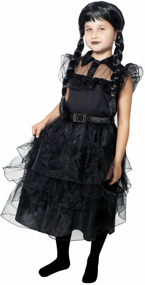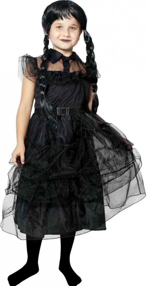 Vnes trochu tajemna mezi své kamarády s tímto skvělým kostýmem, který je ideální pro všechny fanynky temného nadpřirozena. Černé gotické šaty s volány zdobí opasek se sponou. Doporučujeme kombinovat s černou parukou spletenou do copů a tmavými očními stíny. Kostým velikosti S je určen pro děvčata ve věkovém rozmezí 4 - 6 let (105 - 116 cm). Paruka není součástí balení.