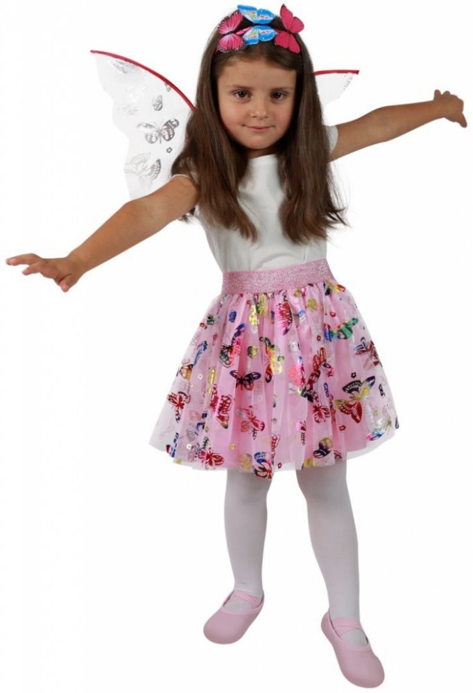 Roztomilá sukýnka TUTU je určena pro holčičky. Nadýchaná sukýnka růžové barvy s potiskem barevných motýlků. Součástí této sady je senzační čelenka a perfektně sladěná křídla.
