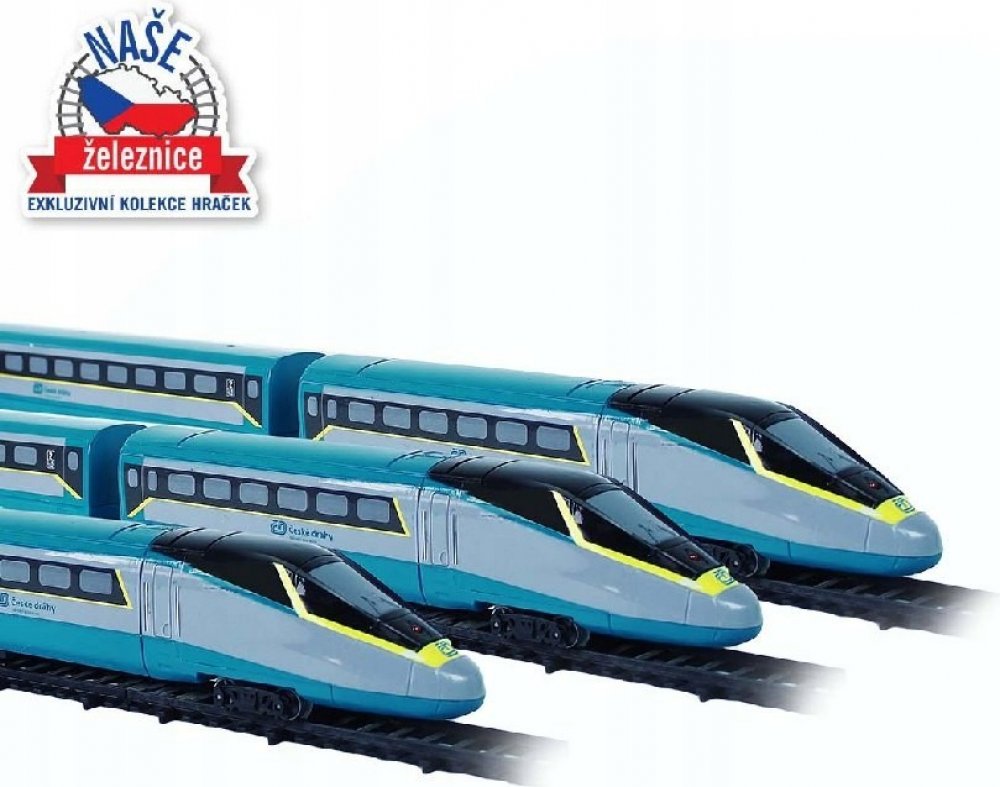 Souprava z kolekce Naše železnice obsahuje lokomotivu, vagón a zadní lokomotivu bez pohonu, 12 zahnutých a 8 rovných kolejí. Lokomotivy měří na délku 26 cm a vagón 30 cm.