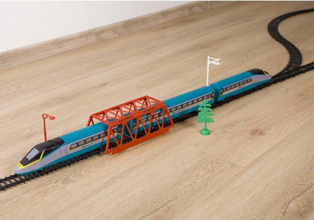 Lokomotiva jezdí, vydává zvuk a svítí. Celková dráha kolejí měří 4,8 m. Velikost koleje rovné je 23 cm a zahnuté 25 cm.