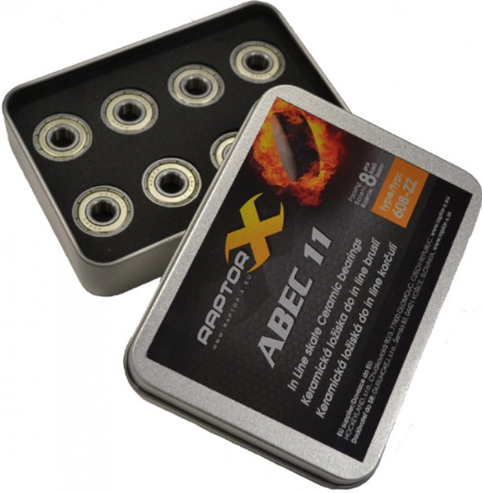 Polokeramická ložiska do kolečkových bruslí od rozvíjející se značky Raptor-X. Ložiska Raptor-X Abec 11 Ceramic se vyznačují kuličkami vyrobenými z keramiky Si3N4 (nitrid křemičitý) a jsou vhodná zejména pro profesionální použití a rychlobruslení. Lze je také použít u všech typů fitness a inline hokejových bruslí, která mají kolečka klasického středu 608ZZ. Ložiska jsou balena v úhledném kovovém pouzdře po 8 kusech, což je počet potřebný na osazení jedné brusle.