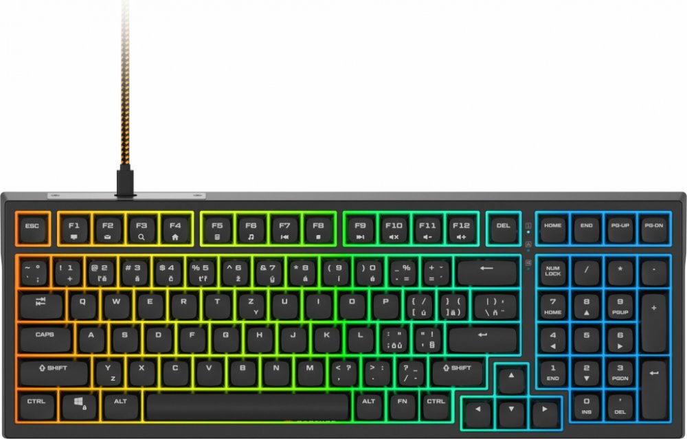 drátová, 98% formát (99 kláves), RGB podsvícení, magnetické spínače Gateron Dual-Rail White, životnost až 150 milionů kliknutí, lubrikované stabilizéry, PBT keycapy s XDA profilem, zámek tlačítka Windows, N-Key rollover, 12 multimediálních kláves (přes klávesu Fn), ANSI layout s CZ/SK lokalizací, odnímatelný opletený USB-C kabel (1,6 m), software v češtině, key puller (RPT-GK98GWHE04B)