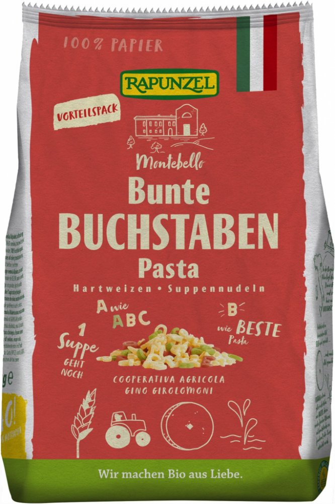 Písmenka jsou velmi oblíbeným tvarem těstovin do polévky zvláště u malých dětí. A co teprve, když jsou různobarevná! Tato písmenka jsou barvena pouze sušenou bio zeleninou.. Sdružení Alce Nero, italský výrobce těstovin značky RAPUNZEL, pěstuje samo veškerou špaldu a převážnou část tvrdé pšenice pro výrobu svých těstovin. Zbytek pšenice je vykupován od biofarmářů z regionů Umbrie, Pulie a Toskánsko...