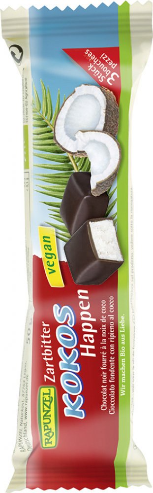 Exotická pochoutka pro milovníky kokosu! Tři bochánky z jemné kokosové směsi slazené sirupem z rýže a agáve, obalené v hořké čokoládě s 55% obsahem kakaa. Bez mléka, vhodné pro vegany. Všechny suroviny pocházejí z kontrolovaného ekologického zemědělství.