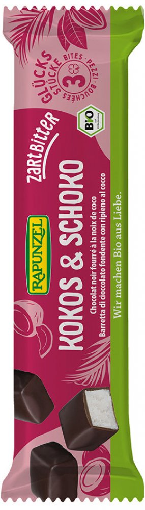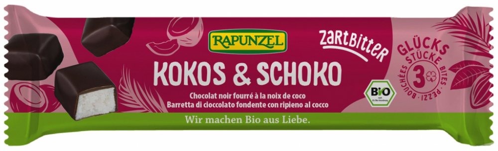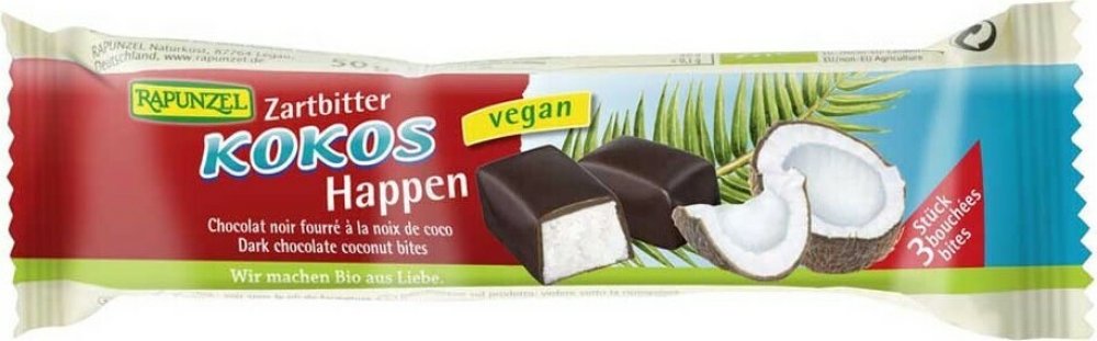 Kokos* 36 %, hořká čokoláda* 25 % (třtinový cukr*, kakaová hmota*, kakaové máslo*, kakaová sušina 55 %), rýžový sirup*, agávový sirup*, sušený rýžový sirup* (rýžový sirup*, slunečnicový olej*, sůl), rýžová mouka*. *z kontrolovaného ekologického zemědělství.