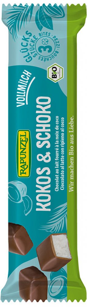 Složení: Strouhaný kokos*(36,00 %), mléčná čokoláda* (25,00 %) (třtinový cukr*, kakaové máslo*, SUŠENÉ PLNOTUČNÉ MLÉKO* (21,00 %), kakaová hmota*), rýžový sirup*, agávový sirup*, rýžový sirup*, rýžový sirup*, rýžová mouka*