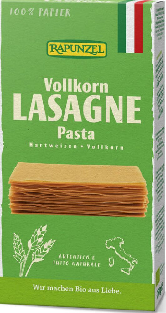 Sdružení Alce Nero, italský výrobce těstovin značky RAPUNZEL, pěstuje samo veškerou špaldu a převážnou část tvrdé pšenice pro výrobu svých těstovin. Zbytek pšenice je vykupován od biofarmářů z regionů Umbrie, Pulie a Toskánsko a těstoviny tak mají čistě italský původ. Jedinou další ingrediencí základní řady těstovin je pramenitá voda z lesů náhorní plošiny Cesane. Výroba lasagní probíhá tradičním způsobem, tj. pomalým sušením přes 5 hodin při nízkých teplotách maximálně do 75 °C. Proto mají přirozenou charakteristickou chuť a při vaření do al dente ideální strukturu. Italské těstoviny RAPUNZEL můžeme skutečně doporučit i opravdovým milovníkům tohoto pokrmu.