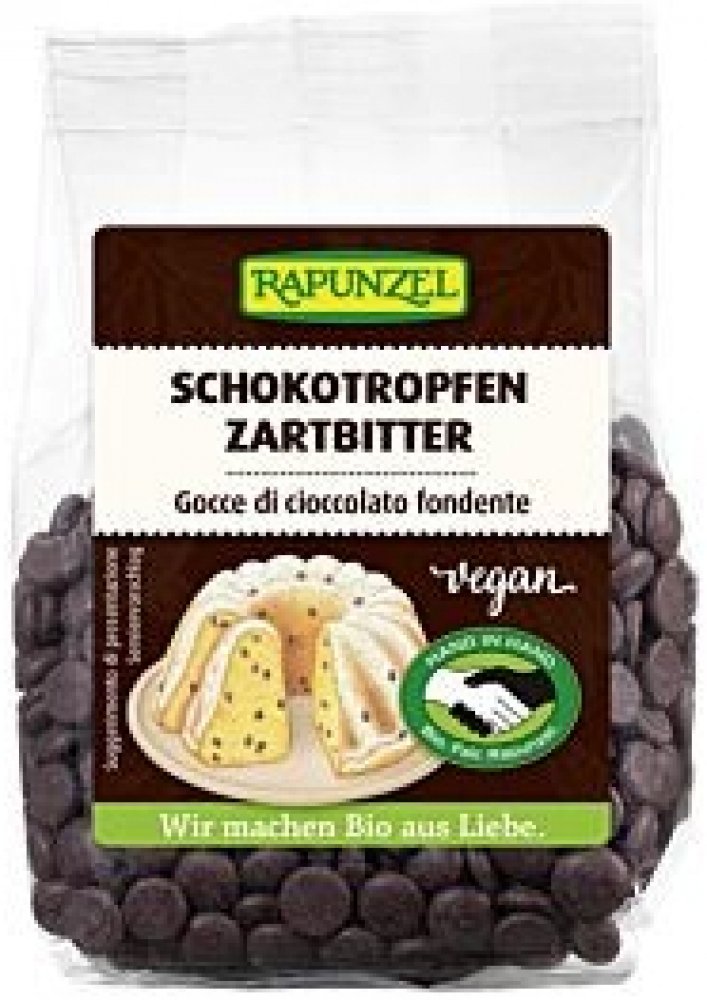 Oblíbená hořká čokoláda v kapkové formě, fair trade od partnerů Rapunzel HAND IN HAND. Čokoládové pecičky si zachovávají svůj tvar i po upečení.