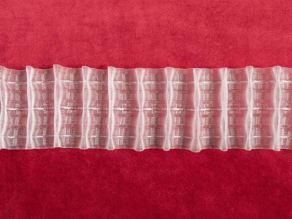 Řasící stuha o šířce 7,5 cm, s pravidelným vlnkovým řasením a doporučeným poměrem řasení 1:2. Uchycení je na háčky, případně je možné zavěšení i na klasické žabky.Provlékací kapsičky na háčky jsou umístěny v několika řadách a umožňují tak různé způsoby výškového uchycení - od cca 1 cm až po 7 cm od horního okraje (měřeno od horního okraje stuhy na střed kapsičky). Tato variabilita výškového nastavení usnadňuje optimální zakrytí kolejničky závěsem. Barva stuhy je plně transparentní.