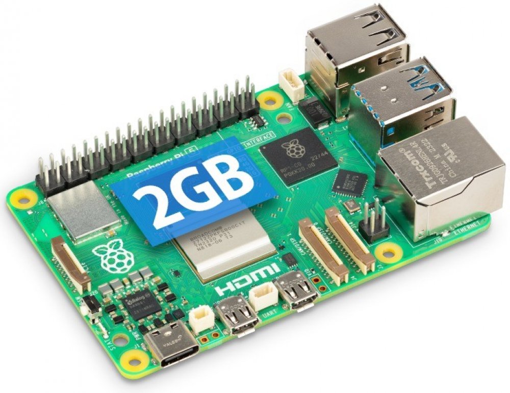 Verze Raspberry Pi 5 vybavená 2 GB RAM . Pátá verze oblíbené raspberry nabízí dva konektory microHDMI, dva porty USB 3.0 a dva porty USB 2.0 , napájecí konektor USB C, dále dva 4řádkové konektory MIPI DSI/CSI pro fotoaparát/displej , port PCI Express 2.0 , a ventilátor, konektor UART a konektor baterie RTC a tlačítko napájení . Deska je dále vybavena dvoupásmovou 2,4 GHz a 5 GHz WiFi, Bluetooth 5 BLE a 1000 Mb/s Ethernet portem s možností napájení PoE.